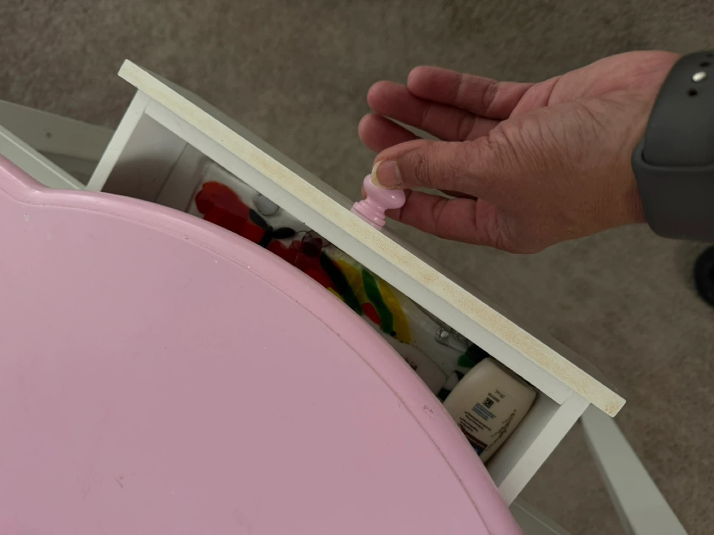 Adorable pink and white kids vanity set. It's got a tri-fold mirror and a single drawer for storing treasures. Perfect for a little one's pretend play! Made of wood composite.