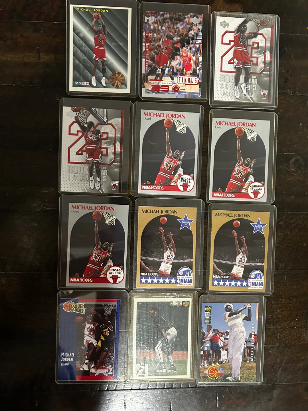 A collection of Michael Jordan basketball cards from various sets like NBA Hoops and Fleer. Includes cards from different years and special editions. These are collector's items for any basketball fan!