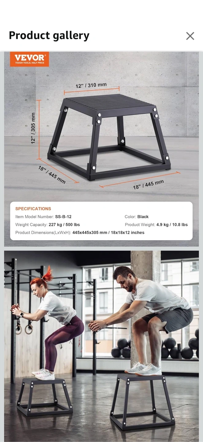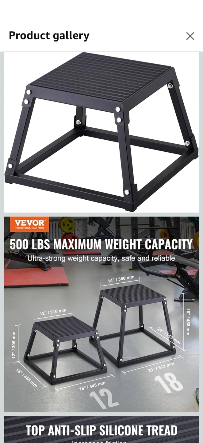 This VEVOR plyometric box is made of durable metal construction. It has a black, anti-slip silicone tread for enhanced grip. The box has a maximum weight capacity of 500 lbs. It's useful for plyometric exercises and cross-training.