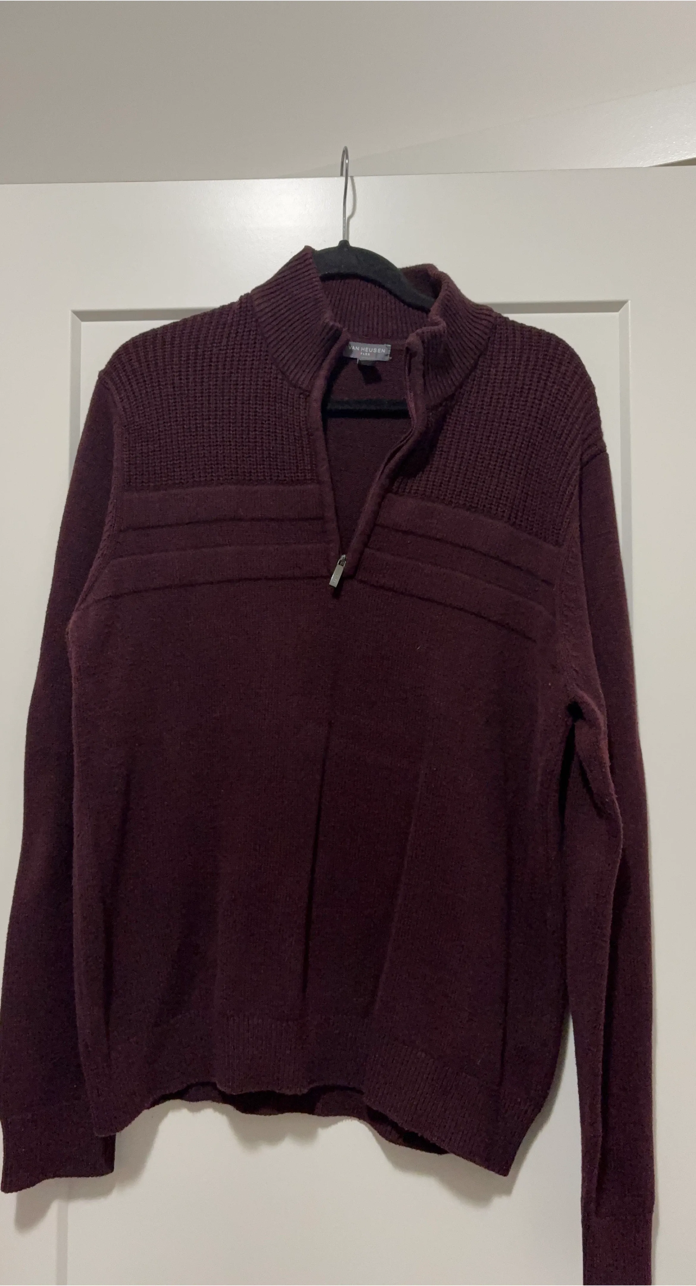 This is a Van Heusen men's quarter zip sweater in a lovely burgundy colour. It features a textured knit on the yoke and ribbed cuffs and hem. Great for layering during cooler weather!