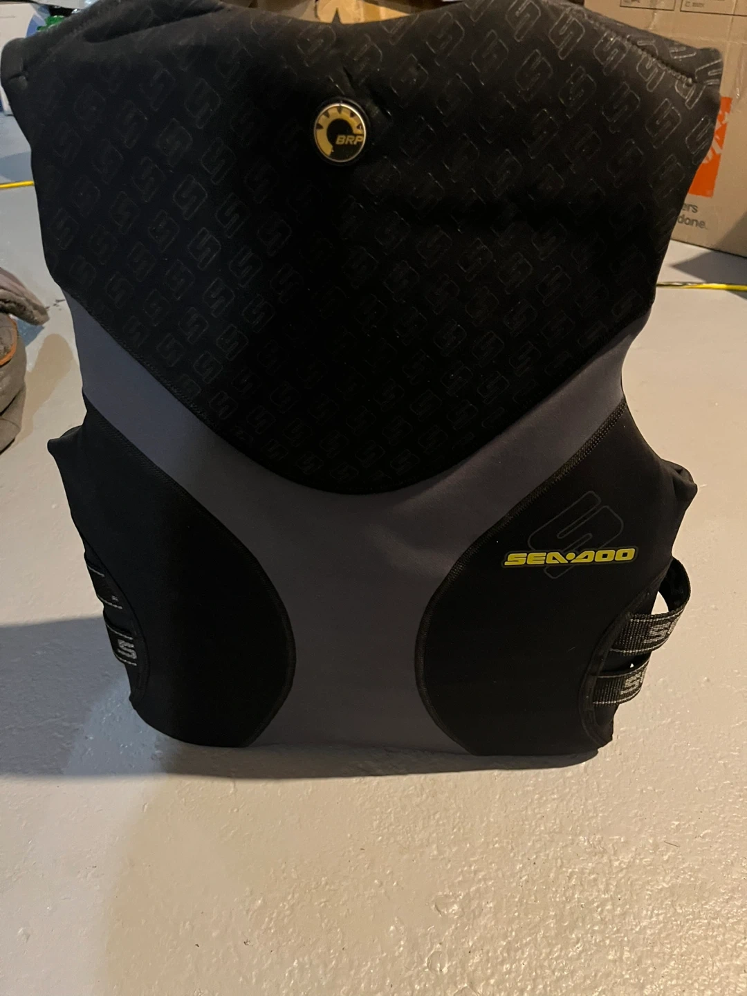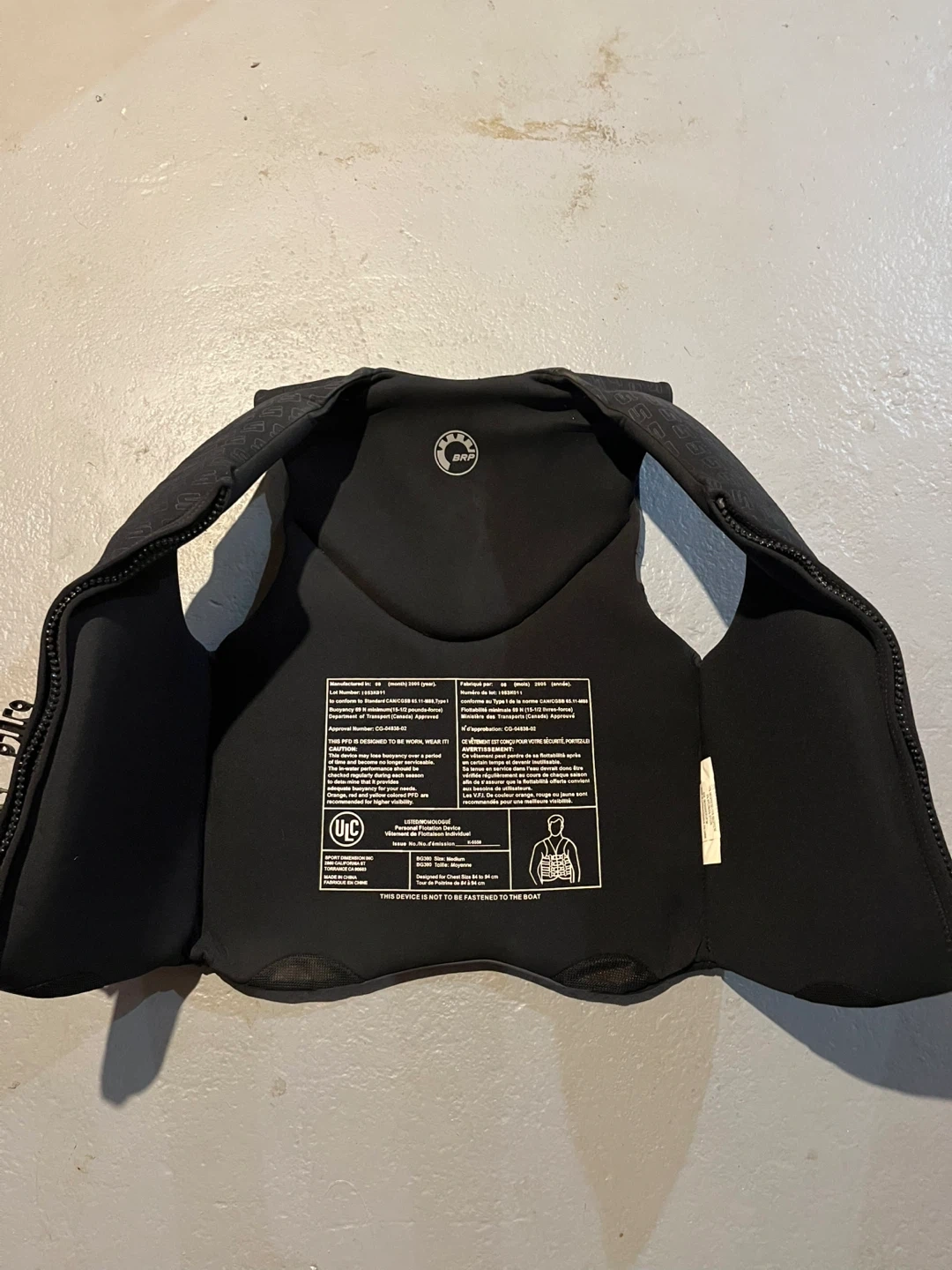 This is a Sea-Doo BG300 personal flotation device (PFD) in a medium size. It's designed for chest sizes 84 to 94 cm. The PFD is made for water activities and provides buoyancy. It comes with adjustable straps and buckles for a secure fit.