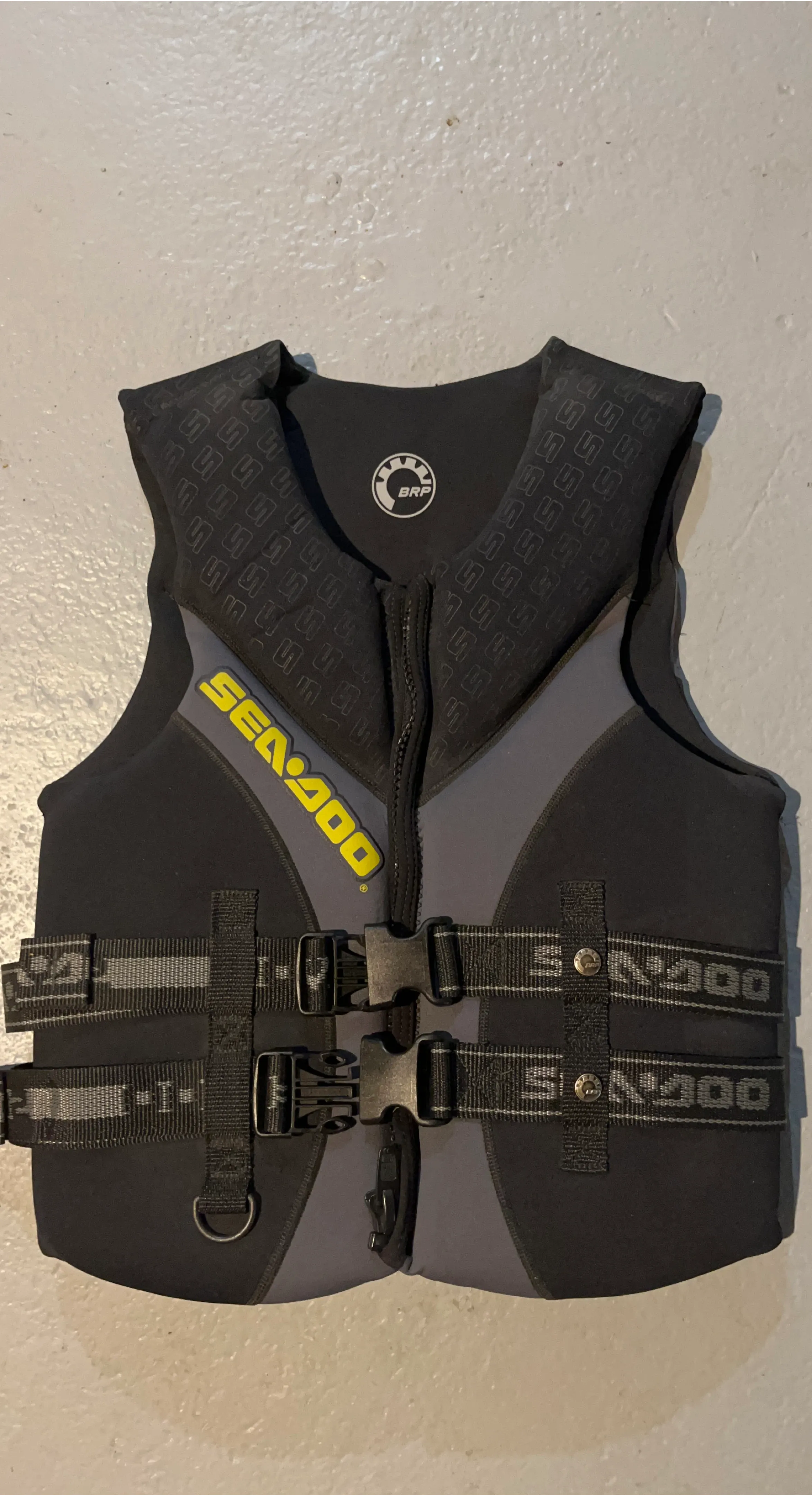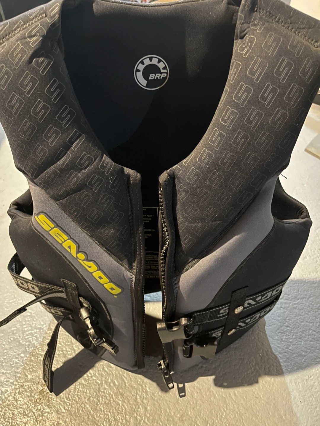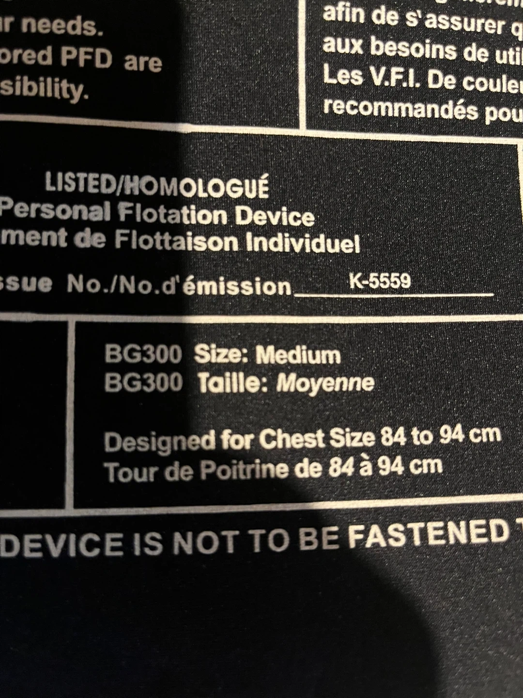 This is a Sea-Doo BG300 personal flotation device (PFD) in a medium size. It's designed for chest sizes 84 to 94 cm. The PFD is made for water activities and provides buoyancy. It comes with adjustable straps and buckles for a secure fit.