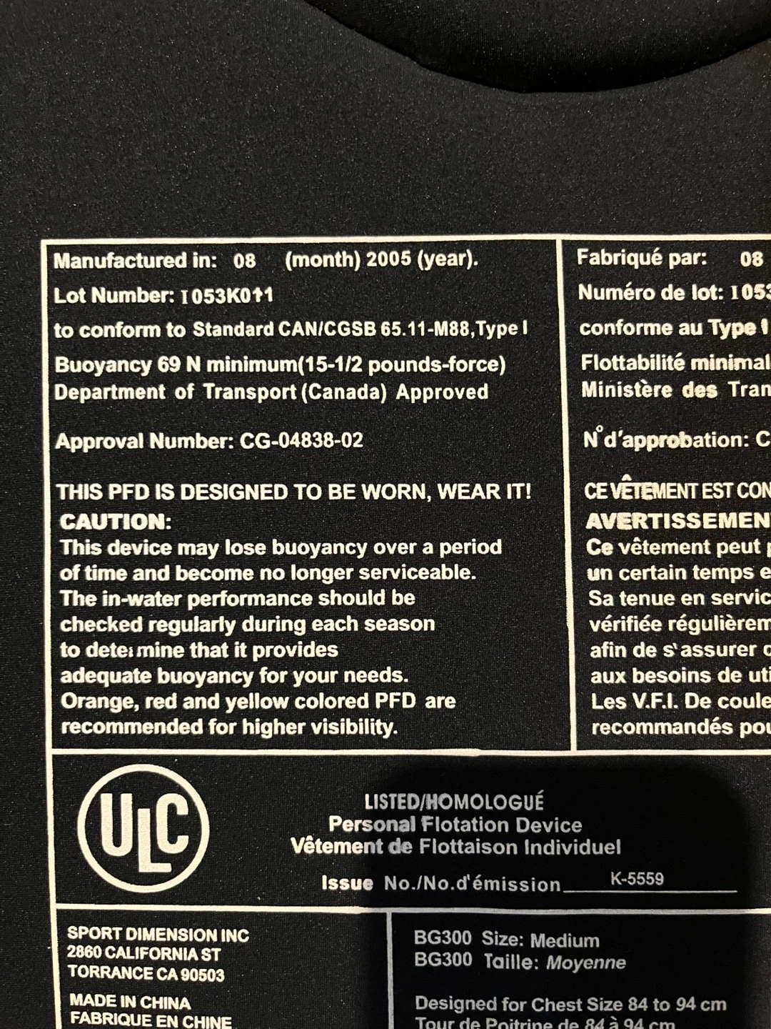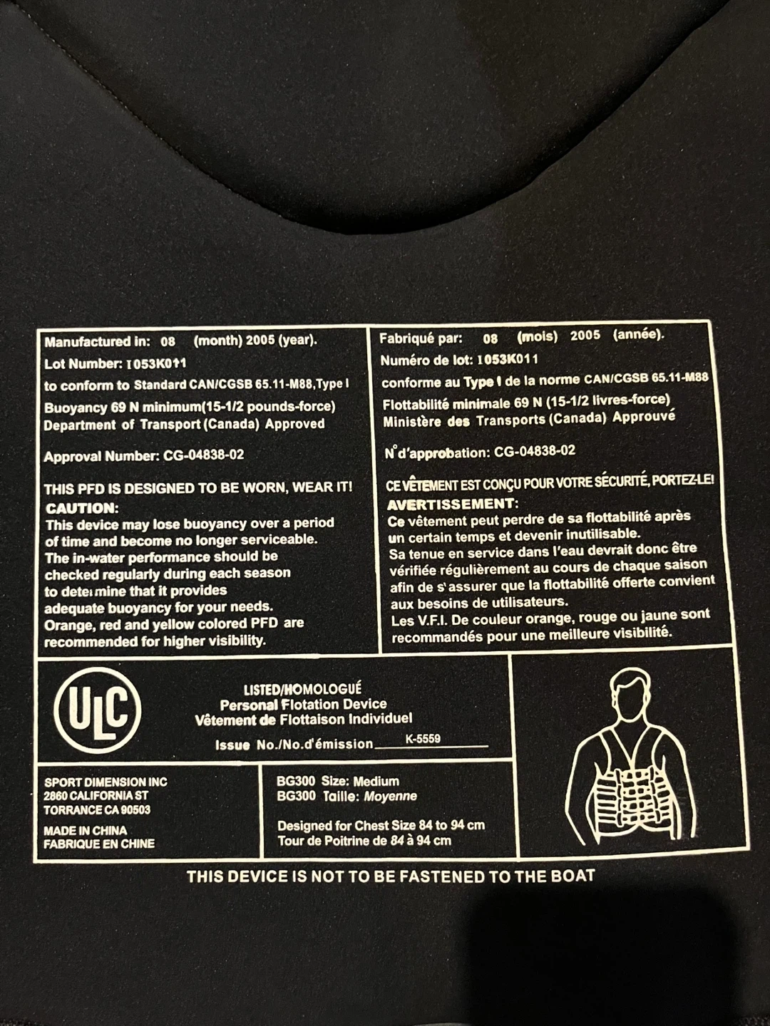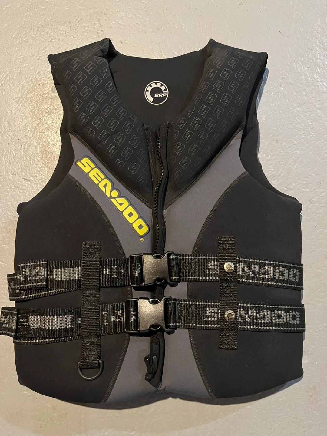 This is a Sea-Doo BG300 personal flotation device (PFD) in a medium size. It's designed for chest sizes 84 to 94 cm. The PFD is made for water activities and provides buoyancy. It comes with adjustable straps and buckles for a secure fit.