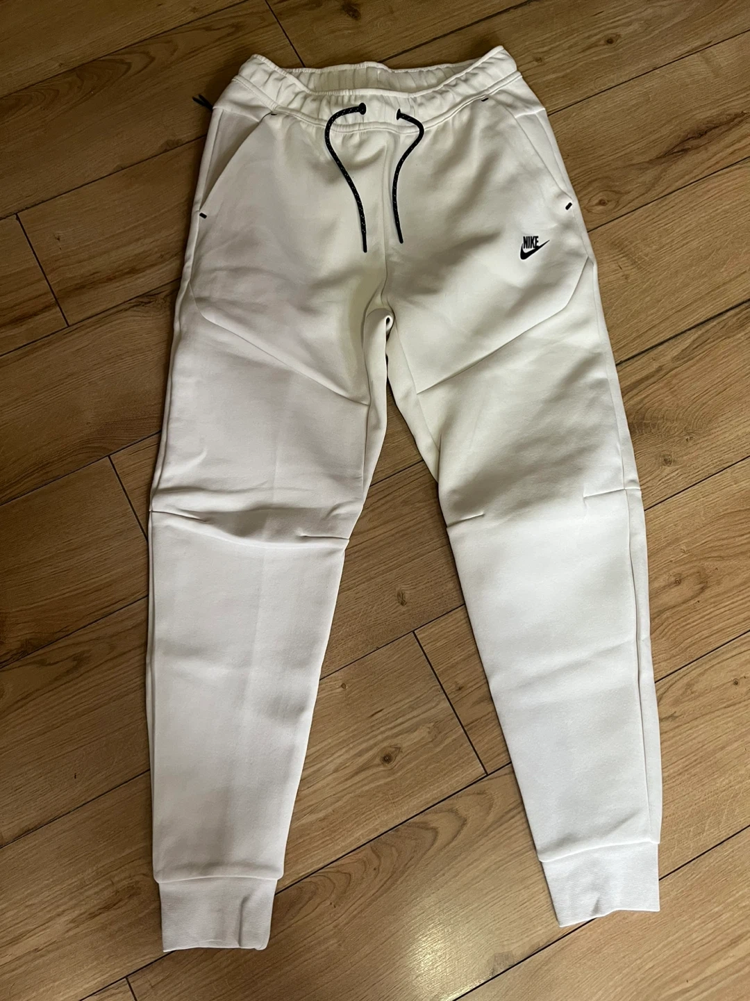 Selling a brand new pair of Nike Tech Fleece men's pants in size small. They are a nice off-white colour. The tag suggests a retail price of $130 CAD