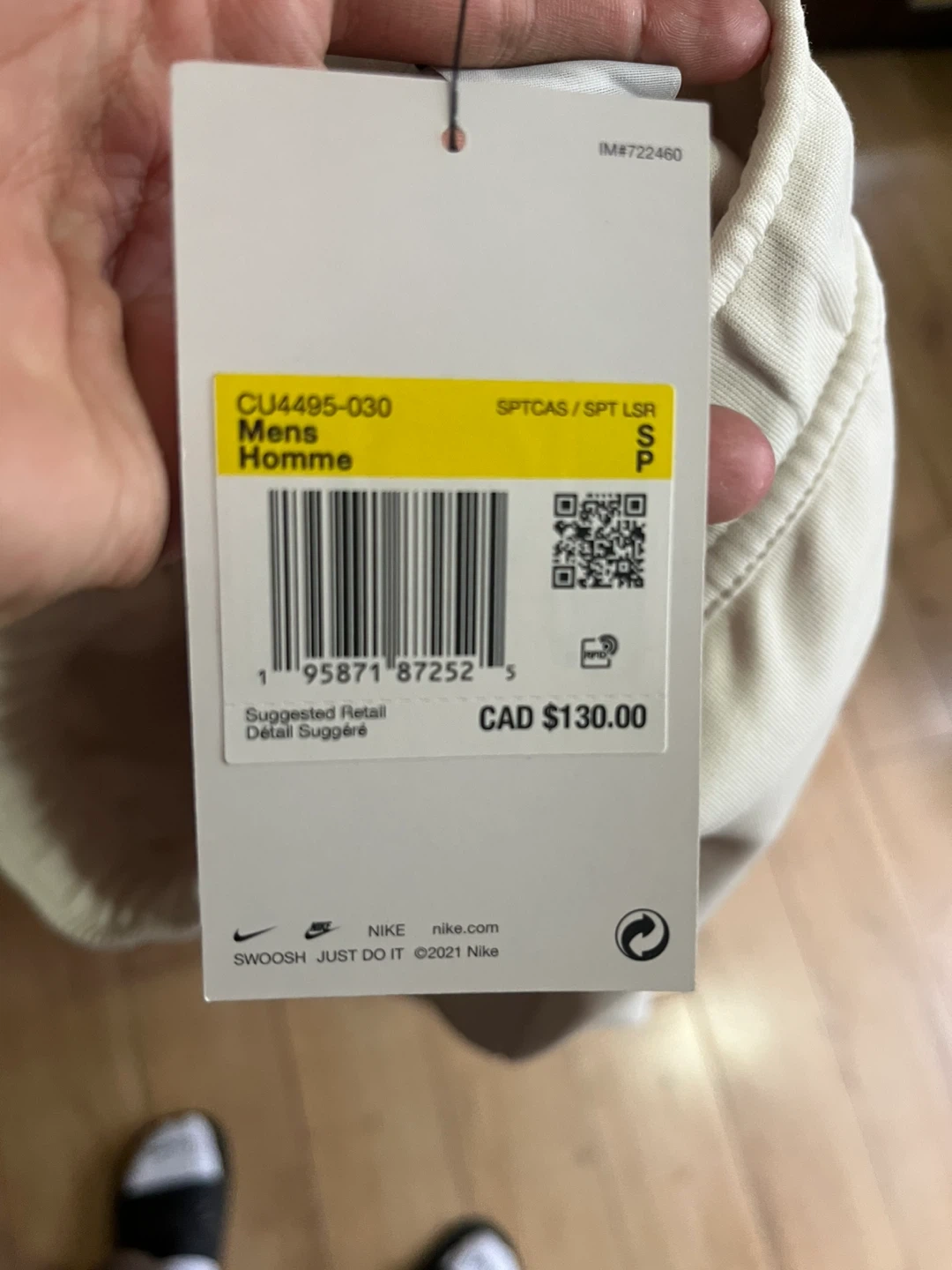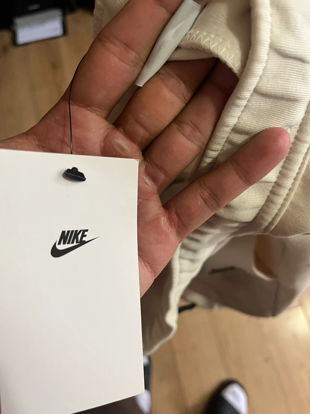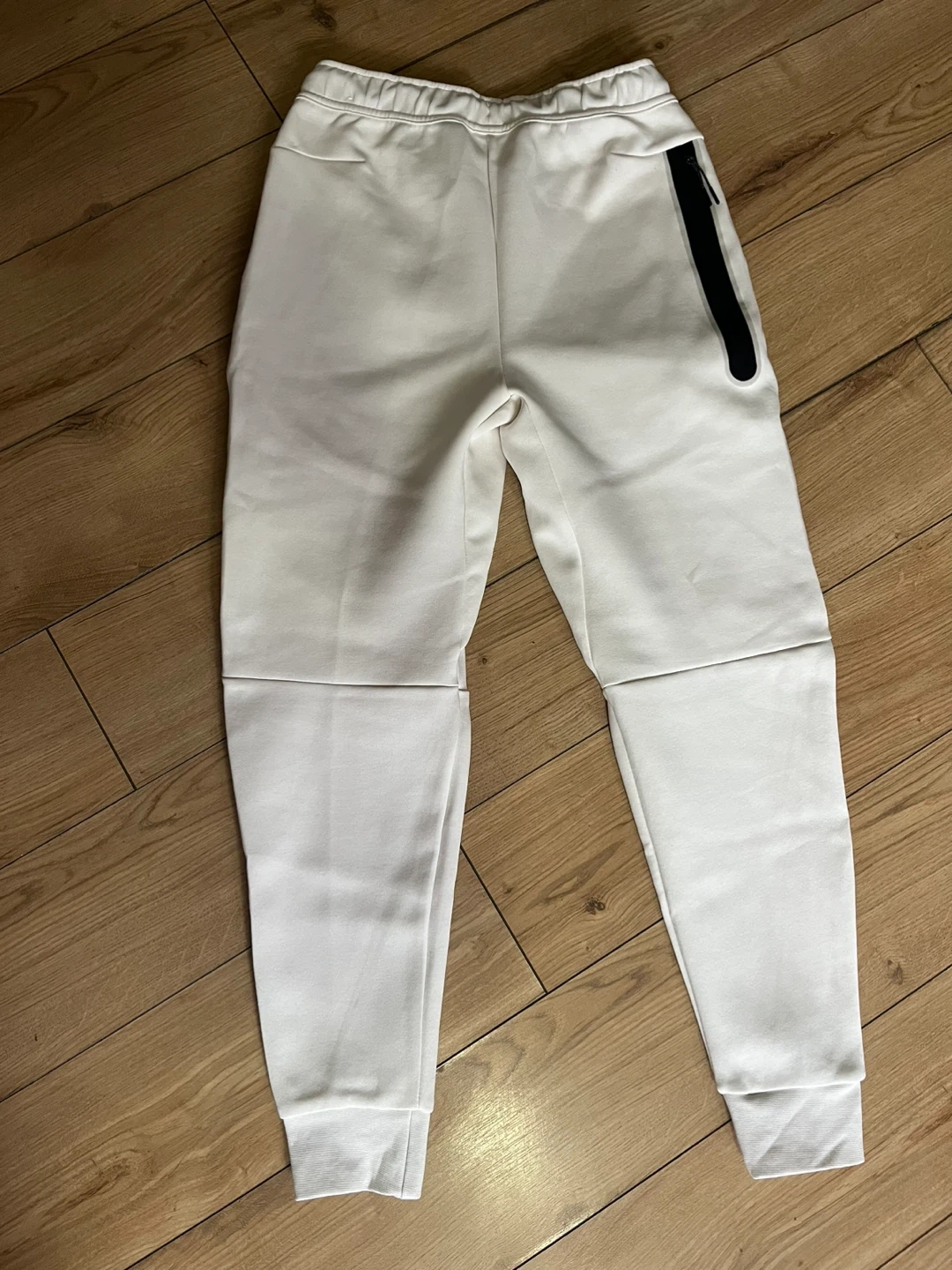 Selling a brand new pair of Nike Tech Fleece men's pants in size small. They are a nice off-white colour. The tag suggests a retail price of $130 CAD