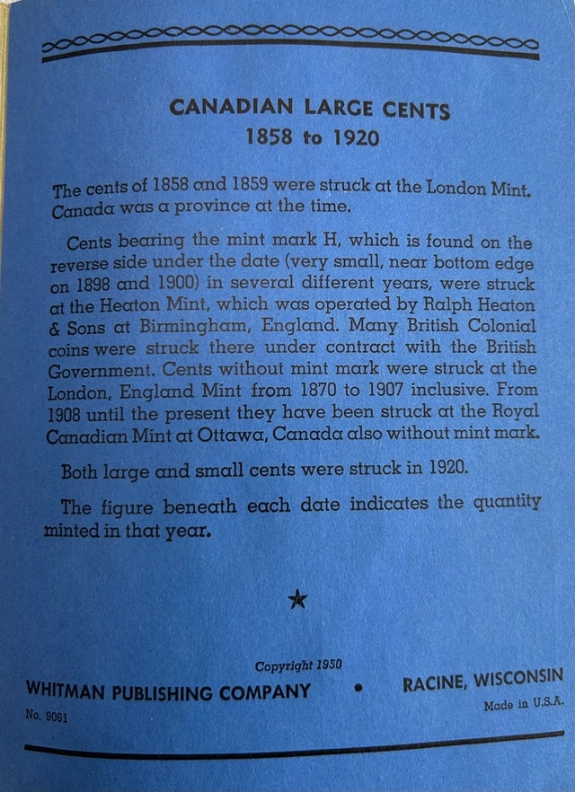 This is a Whitman album of Canadian Large Cents from 1858 to 1920. The album is partially completed with 23 coin slots filled. This is a great opportunity to get a head start on collecting these classic Canadian coins. If the ad is live, the item is available! Cash accepted.