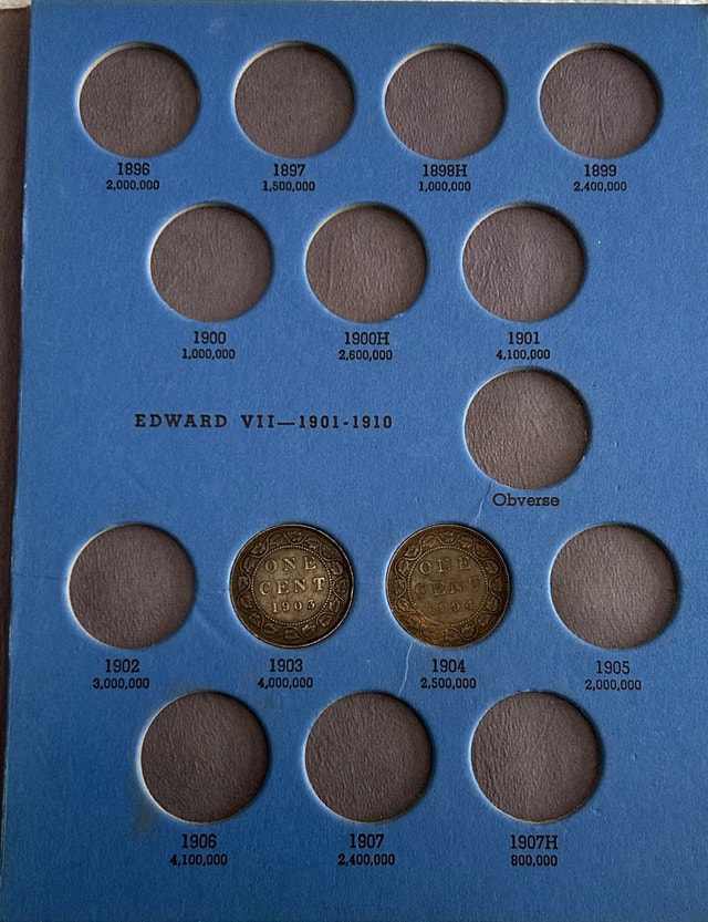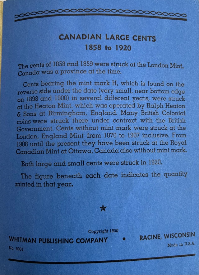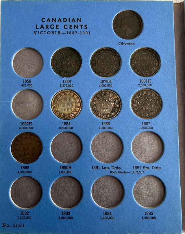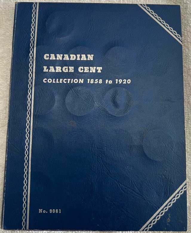 This is a Whitman album of Canadian Large Cents from 1858 to 1920. The album is partially completed with 23 coin slots filled. This is a great opportunity to get a head start on collecting these classic Canadian coins. If the ad is live, the item is available! Cash accepted.