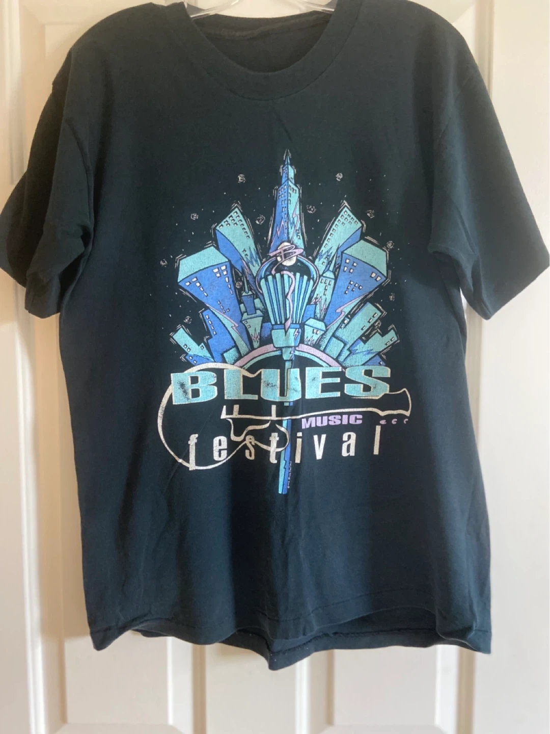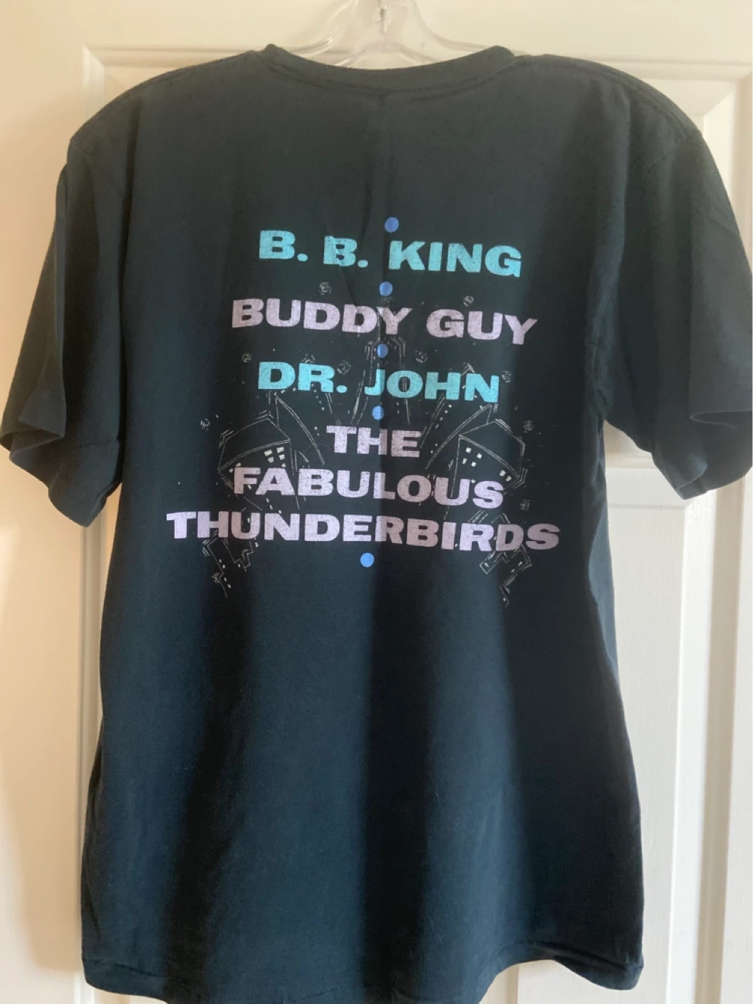Black t-shirt with "Blues Music Festival" graphic on the front. Features B.B. King, Buddy Guy, Dr. John, and The Fabulous Thunderbirds on the back. Cotton material.