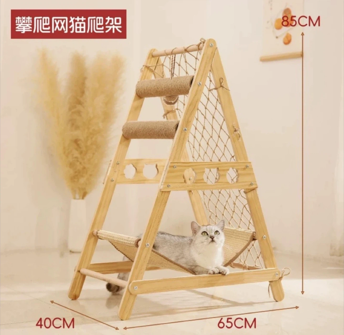 This A-frame cat tree has a hammock for lounging and multiple scratching posts wrapped in sisal rope. It's constructed from natural wood and has a compact design with cut-out cat shapes. Dimensions: 65cm long, 40cm wide, and 85cm high.