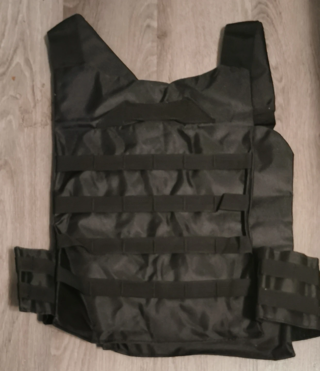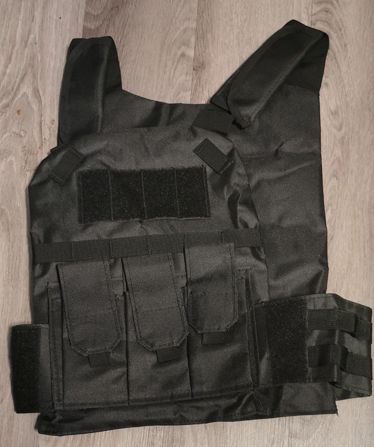 This tactical vest is black and features a customizable attachments. It includes adjustable shoulder straps and belts for a secure fit. It's made of durable nylon material.