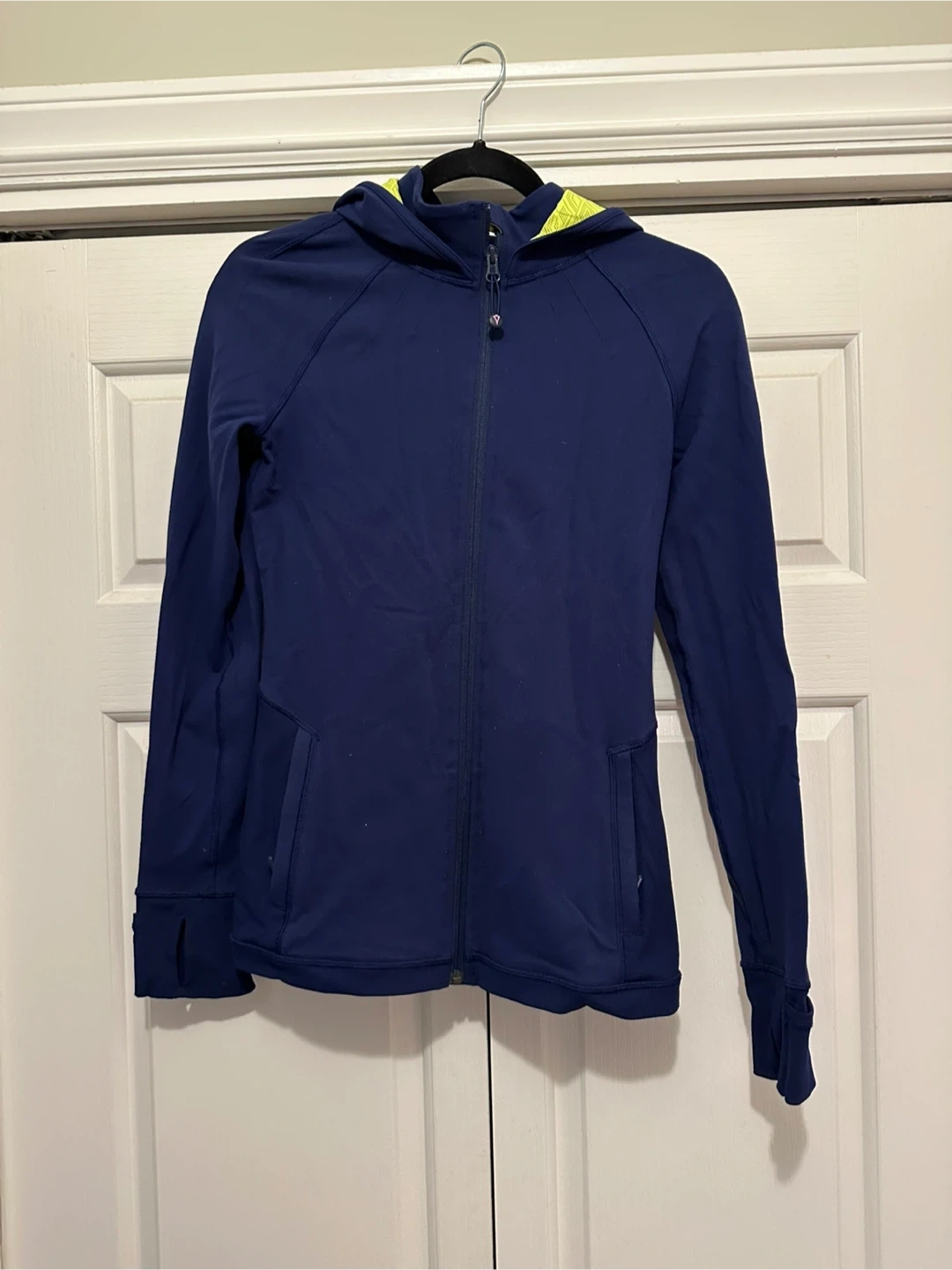 This is a Ivivva (Lululemon) jacket in navy blue , neon yellow lining in hood. It has a hood and thumb holes. Perfect light jacket going to dance class, etc Size 14