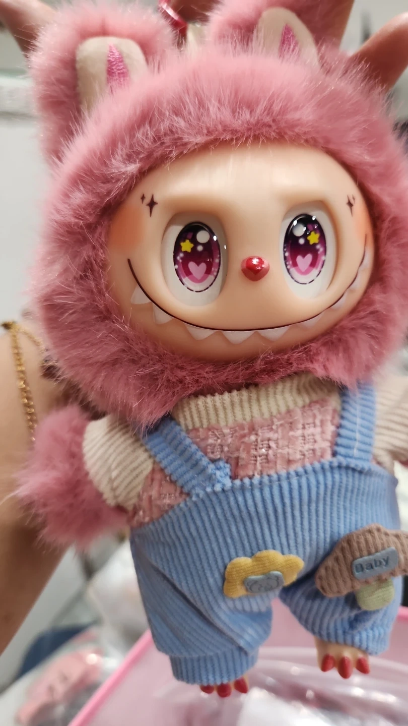 Selling a cute Labubu Zimomo doll! It's in great condition and ready for a new owner. The doll has a pink furry hood and blue overalls with adorable details. It's a unique and charming piece to add to any collection