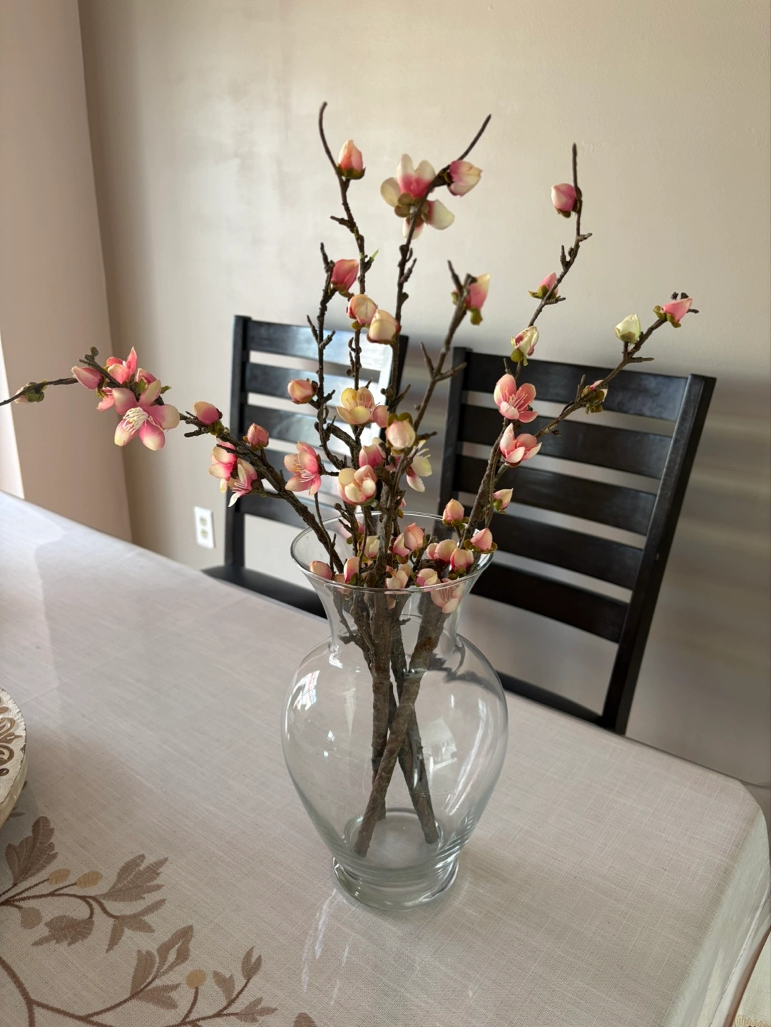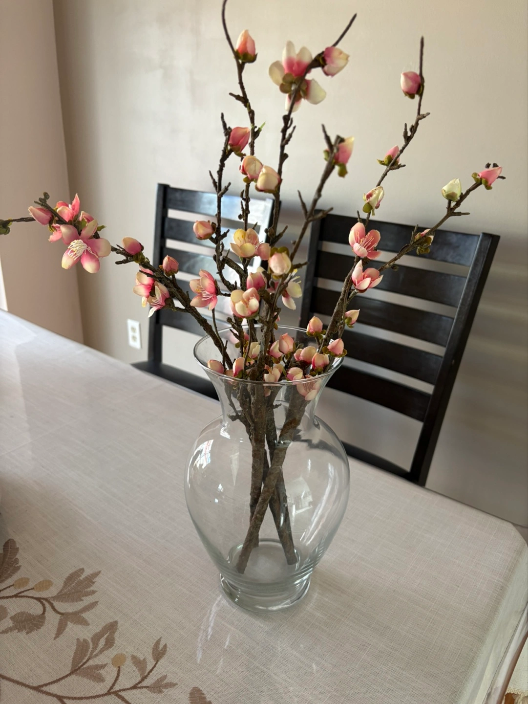 Artificial Pink Blossom Branches in Clear Glass Vase
