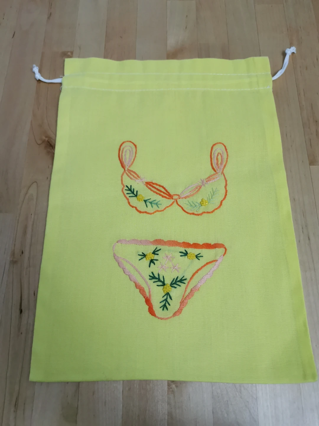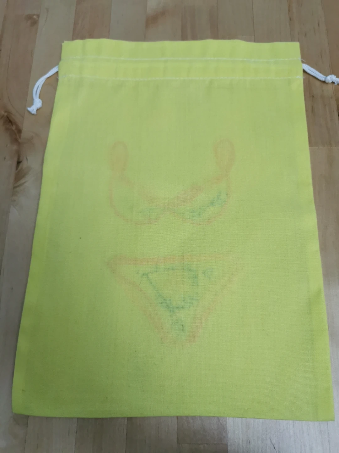 This is a cute yellow drawstring bag with an embroidered lingerie design. It's perfect for storing small items or using as a gift bag! The bag is in great condition and ready for a new use