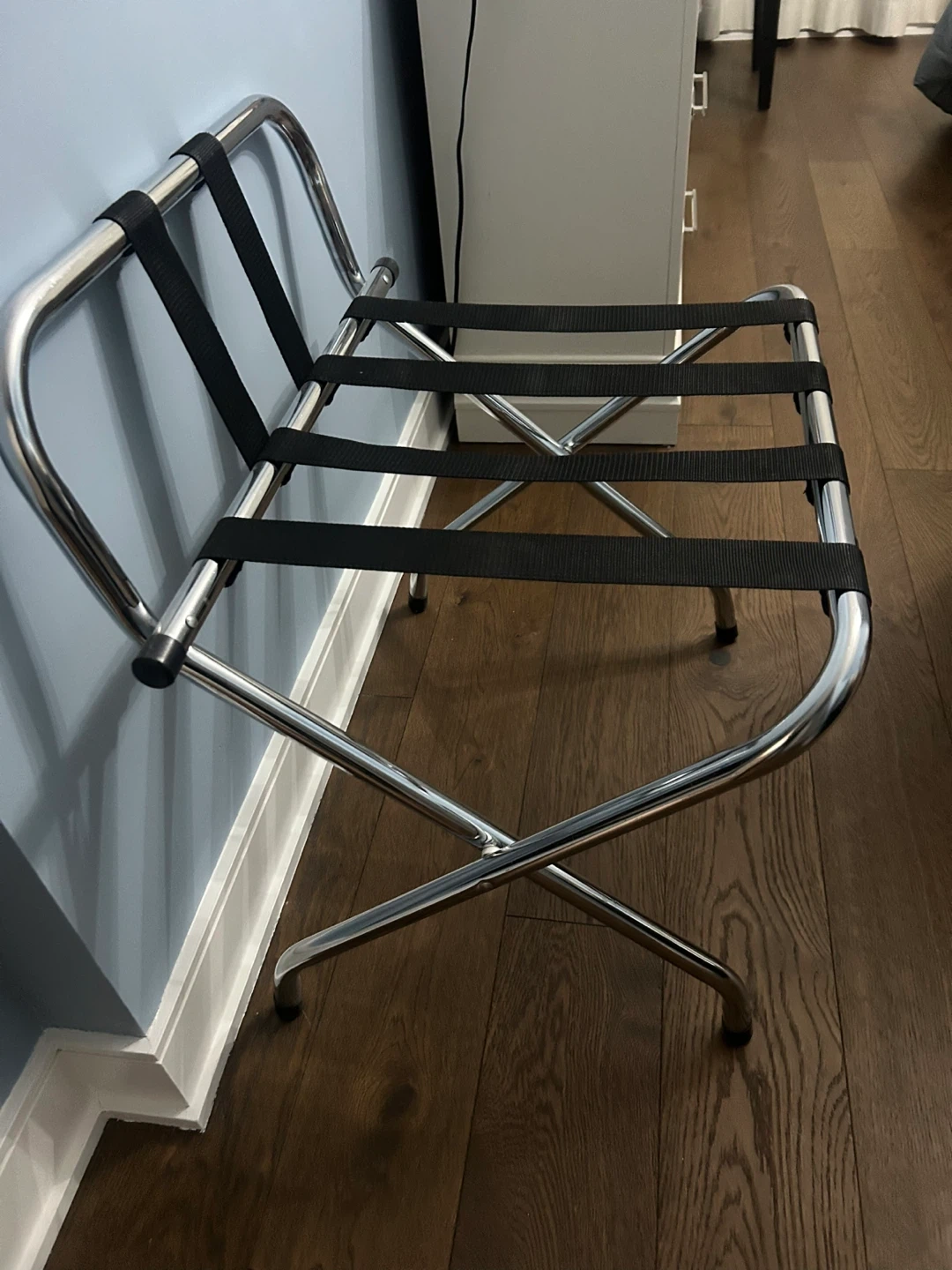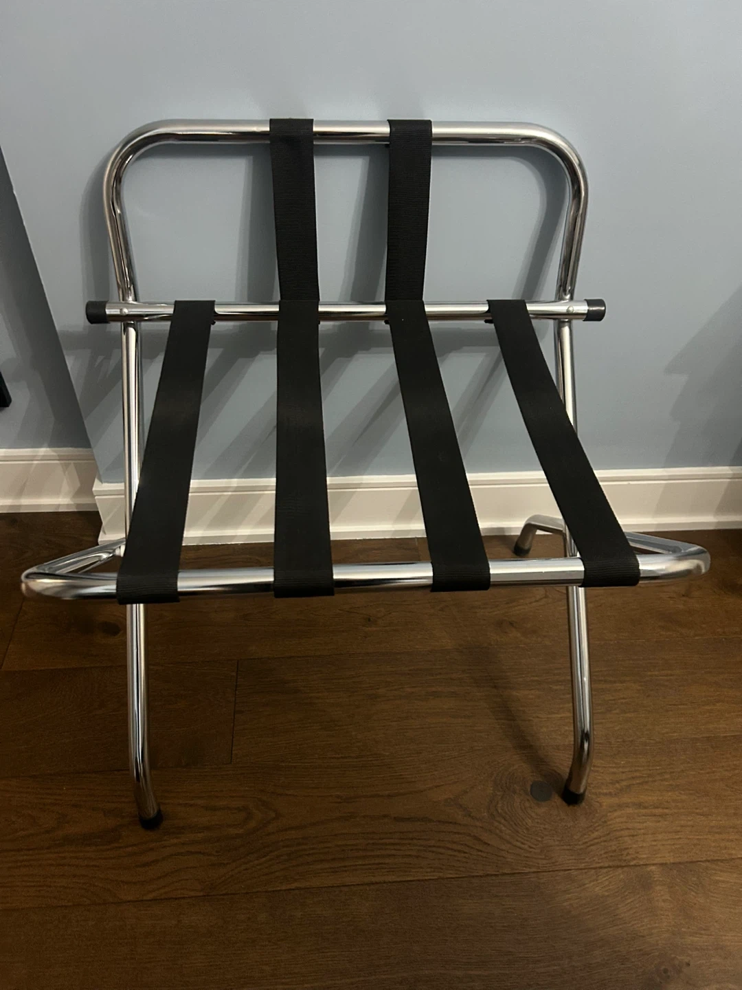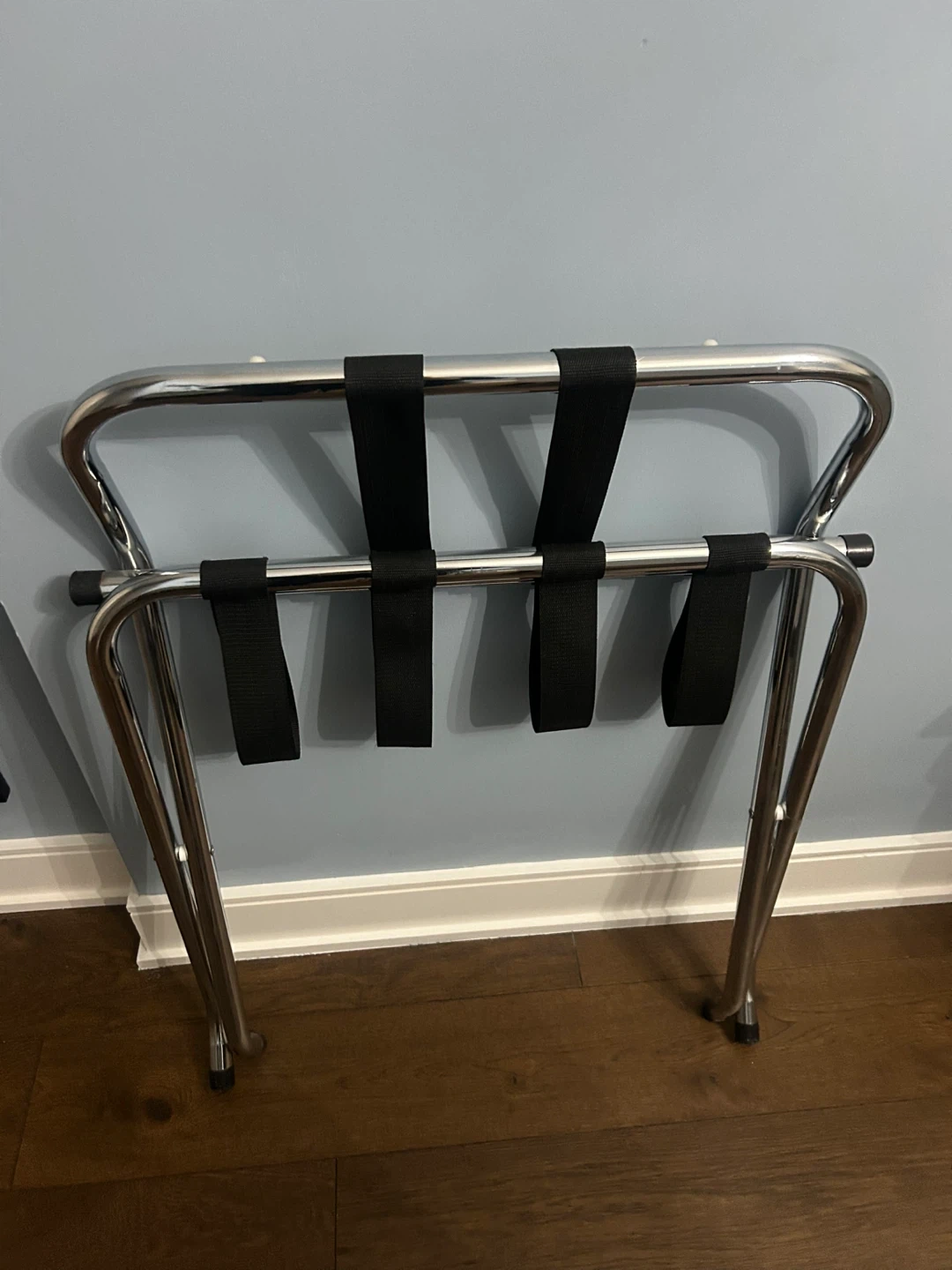Selling a folding luggage rack in great condition! It features a sturdy chrome finish and black straps. Perfect for guests or keeping your suitcase off the floor. Folds up easily for storage when not in use