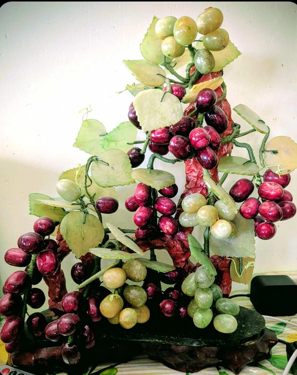 A decorative sculpture featuring grape clusters made from polished jade and carnelian stones. The leaves and branches are intricately detailed. It's mounted on a dark wooden base. This piece brings a touch of natural elegance to any space!