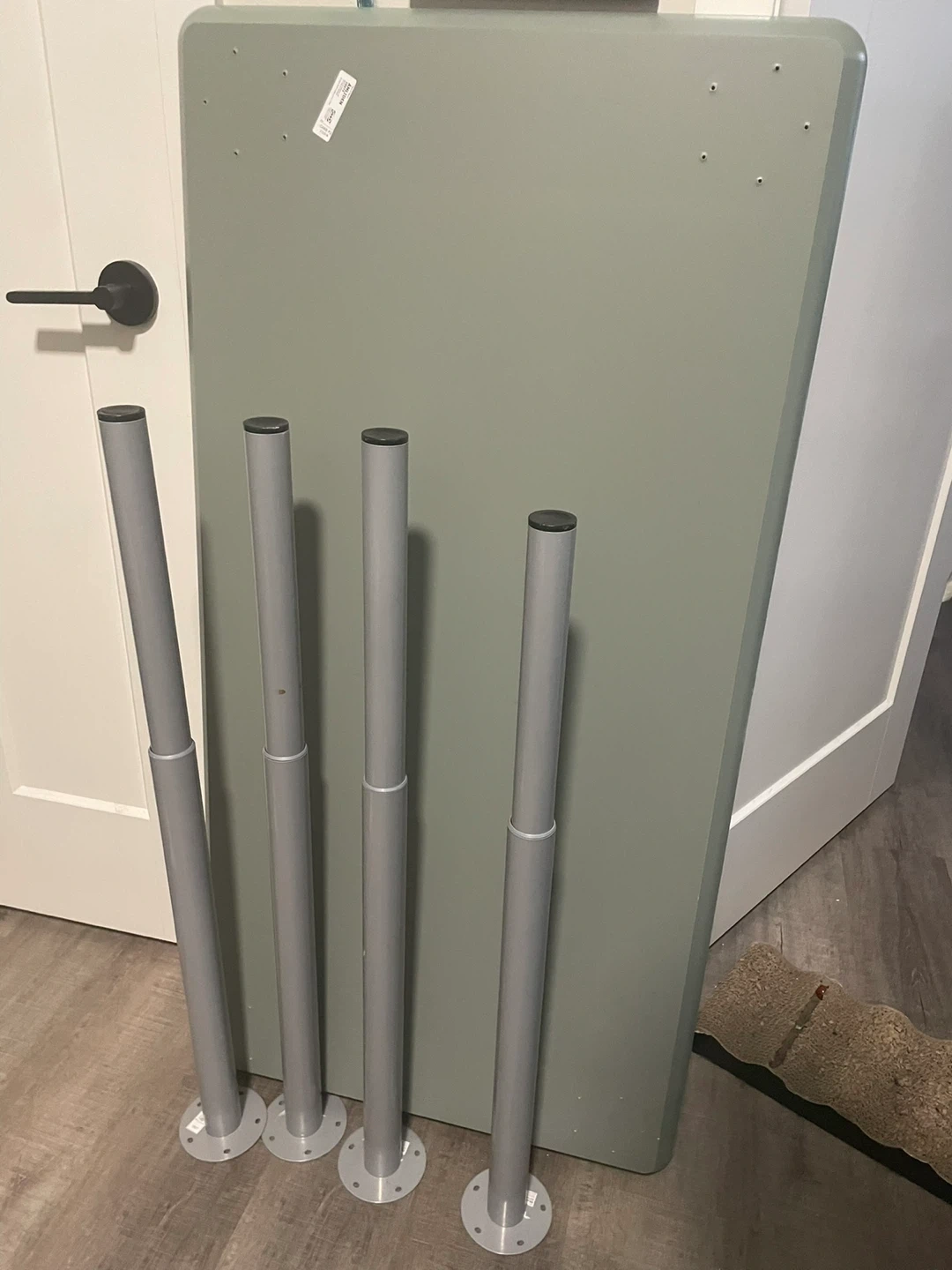 This is an IKEA AMLIDEN table top in a grey-green colour, measuring 120cm long by 60cm wide. It comes with four adjustable OLOV legs in grey. These legs are useful for creating a custom-height desk or table.