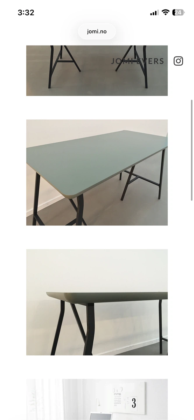 This is an IKEA AMLIDEN table top in a grey-green colour, measuring 120cm long by 60cm wide. It comes with four adjustable OLOV legs in grey. These legs are useful for creating a custom-height desk or table.