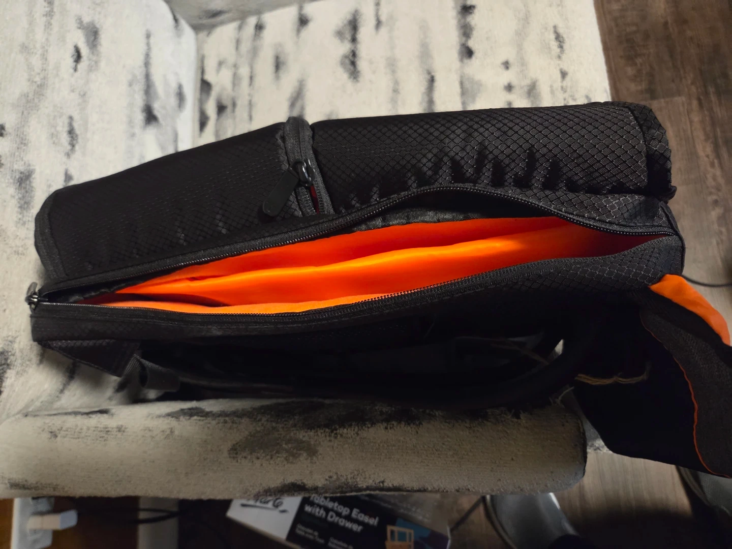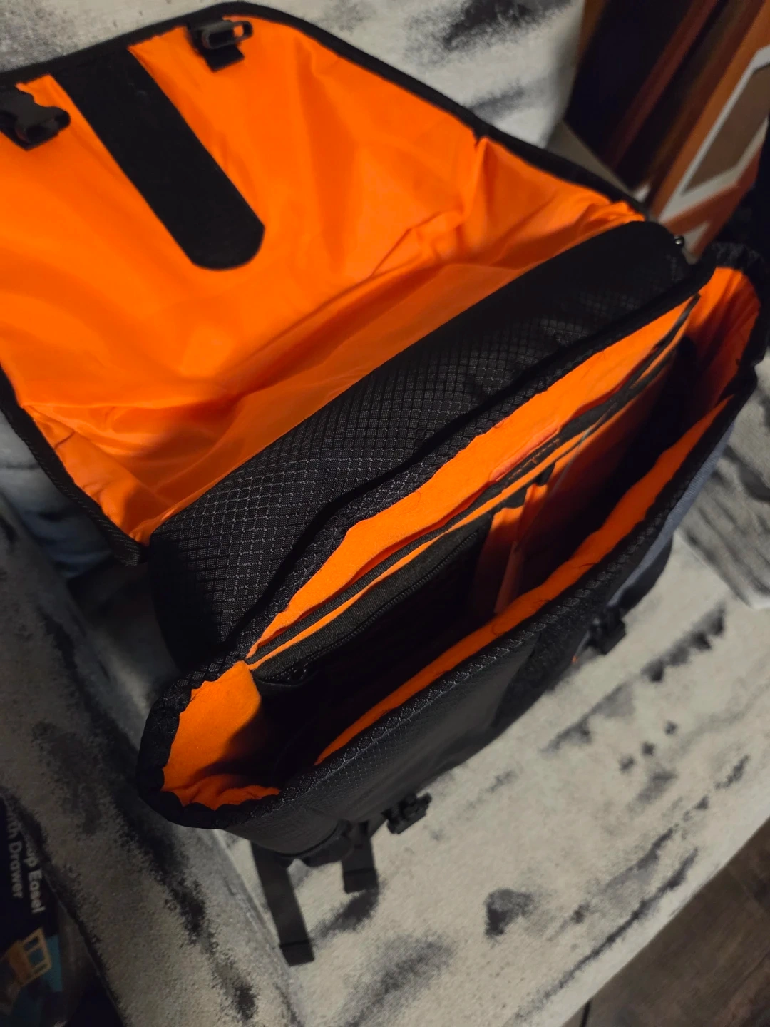 This black Flight Outfitters backpack is designed for pilots. It's got a durable exterior with orange lining inside for easy visibility. The roll-top closure helps keep your gear secure and dry.