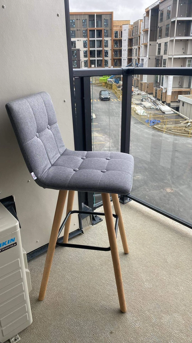 A mode nfabric bar stool with a wooden frame and a black footrest.