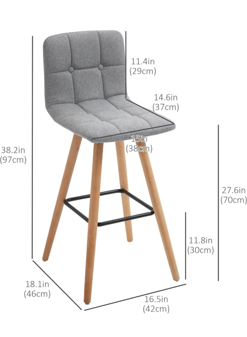 A mode nfabric bar stool with a wooden frame and a black footrest.