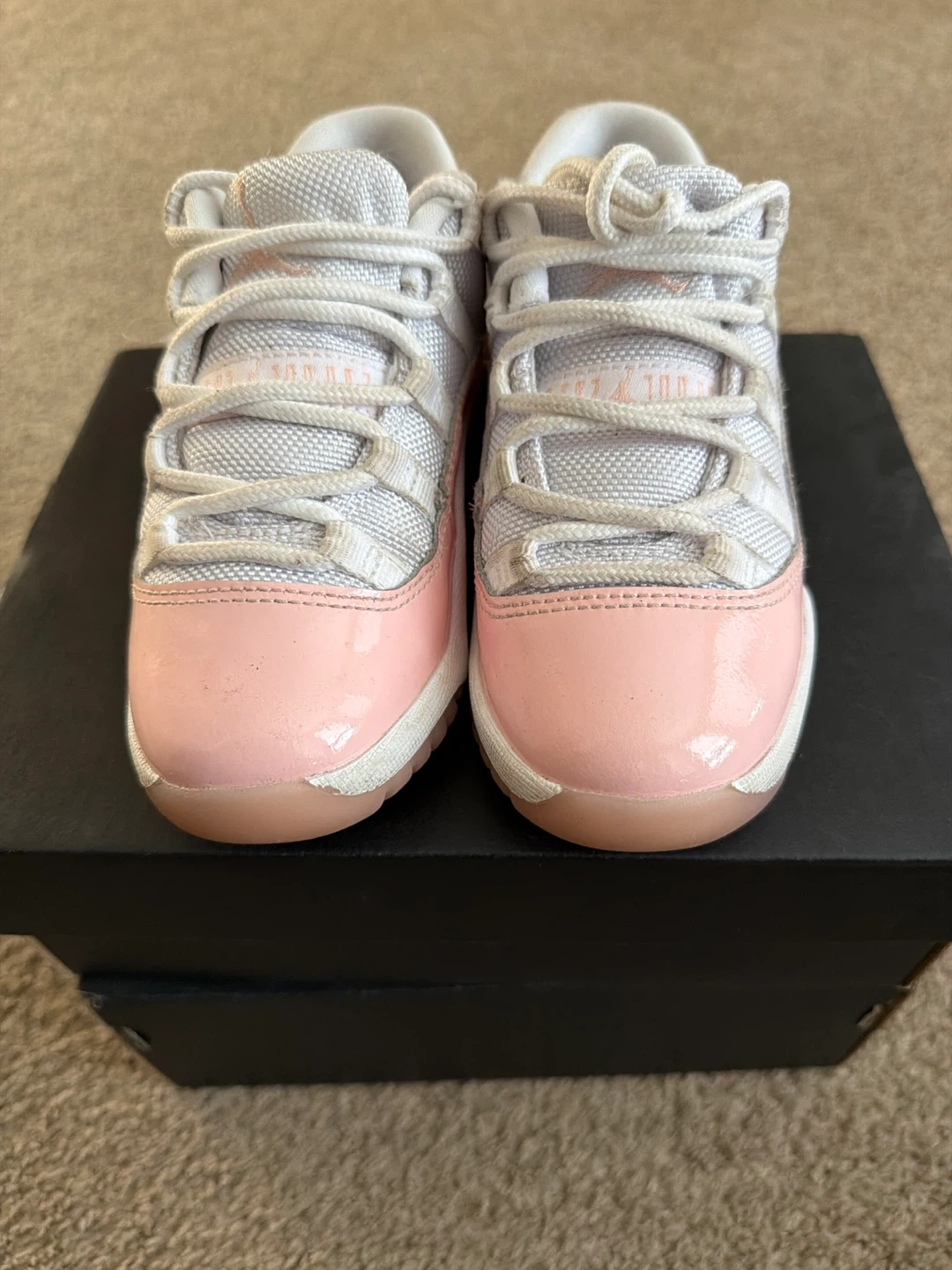 Toddler-sized Air Jordan 11 Low sneakers in white/ legend pink color. Features a patent leather toe and lace detailing. Comes with original box. Perfect for little ones who love classic kicks!