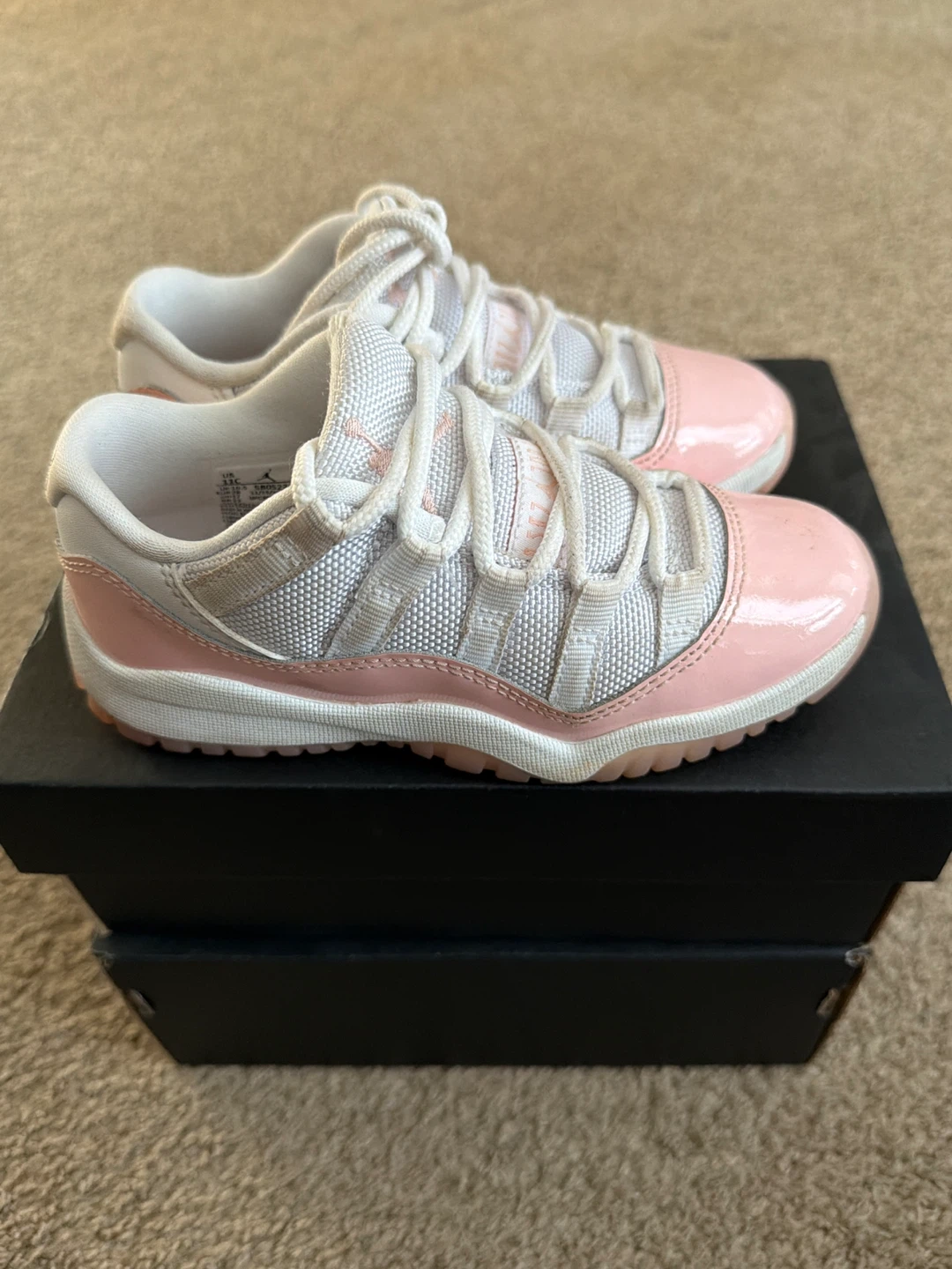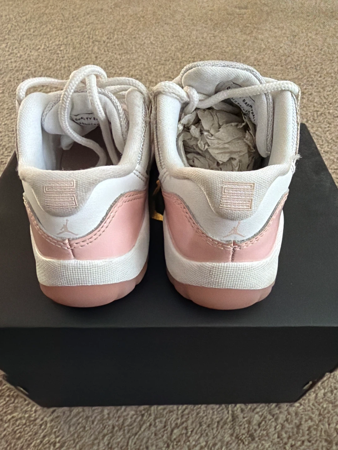 Toddler-sized Air Jordan 11 Low sneakers in white/ legend pink color. Features a patent leather toe and lace detailing. Comes with original box. Perfect for little ones who love classic kicks!
