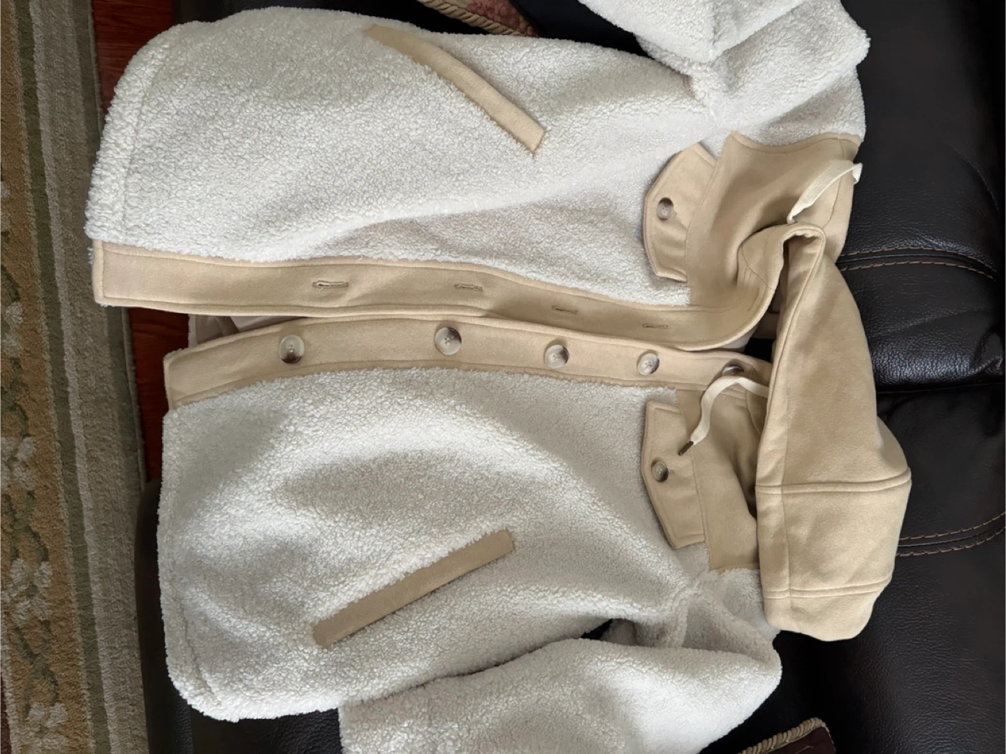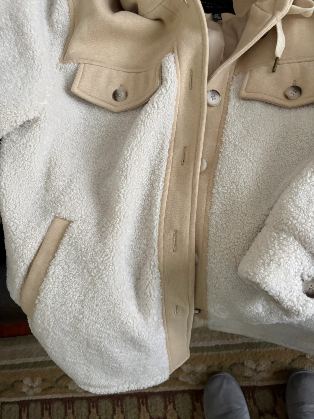 Cozy up in this stylish Sanctuary sherpa jacket. It's a cream and tan colour, and has a button-up front and two chest pockets. Perfect for cooler weather! Brand new - never worn