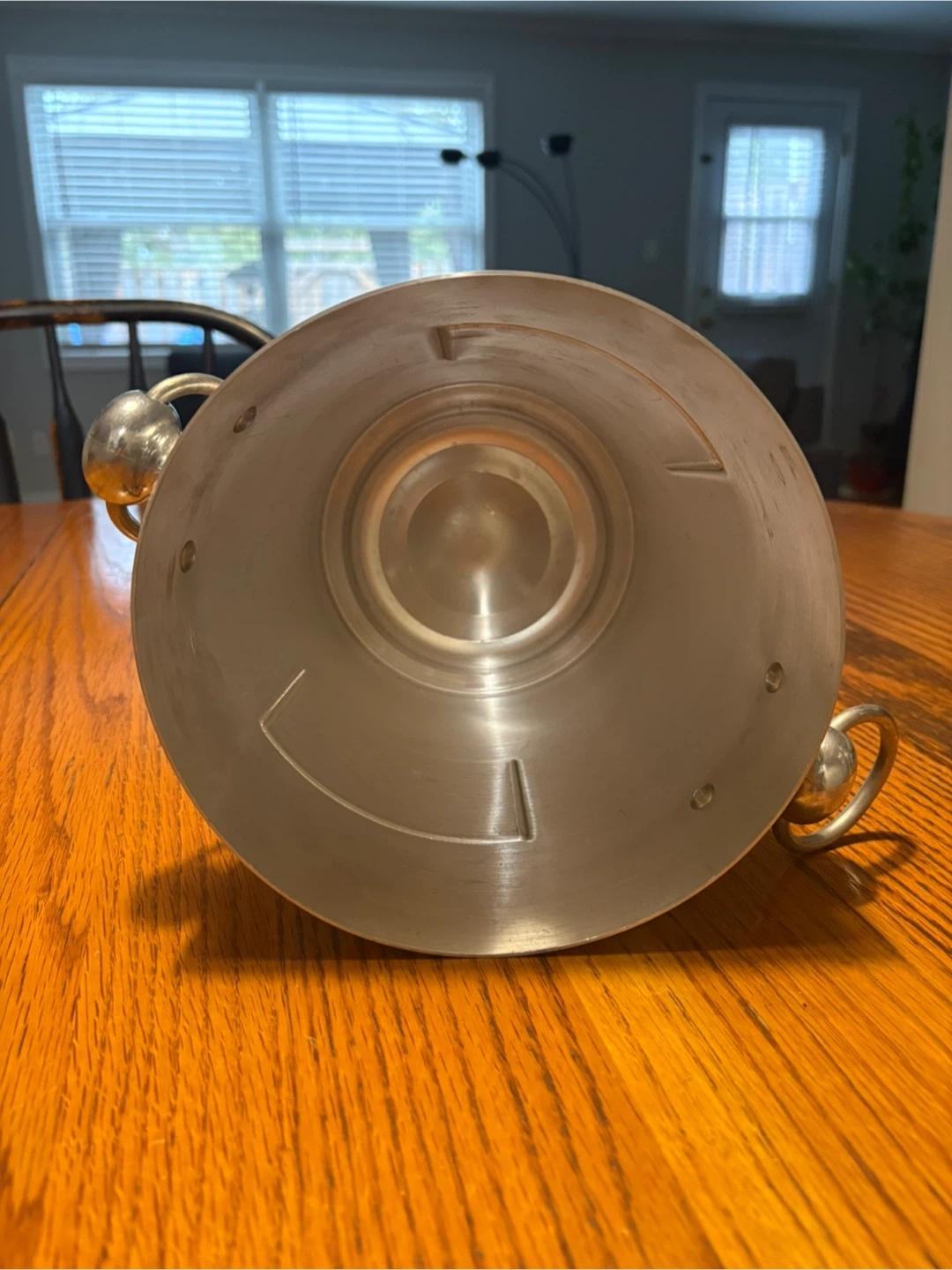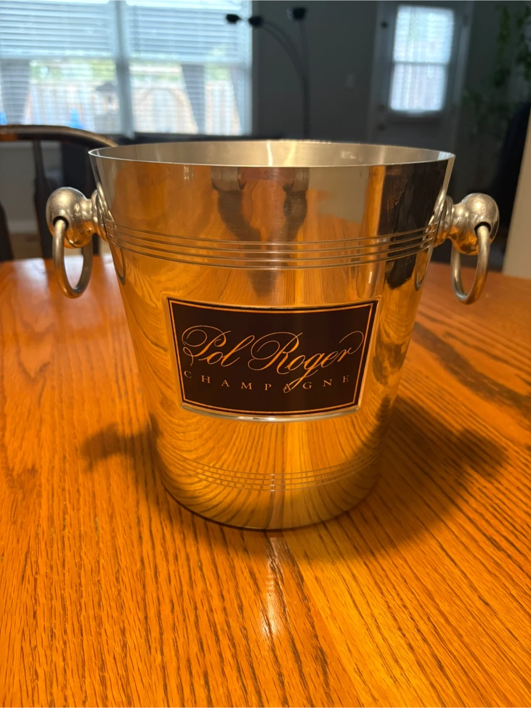 A classic Pol Roger champagne ice bucket with side handles. Made in France. It's made of metal with a silver-tone finish. This bucket is great for keeping your champagne chilled at parties or special occasions!