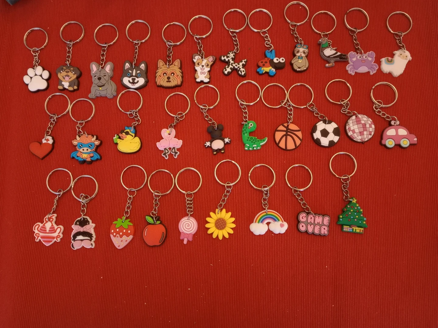A collection of novelty keychains with various cute charms. These keychains feature playful designs like animals, food, and objects. They're great for personalizing bags, backpacks, or keys.