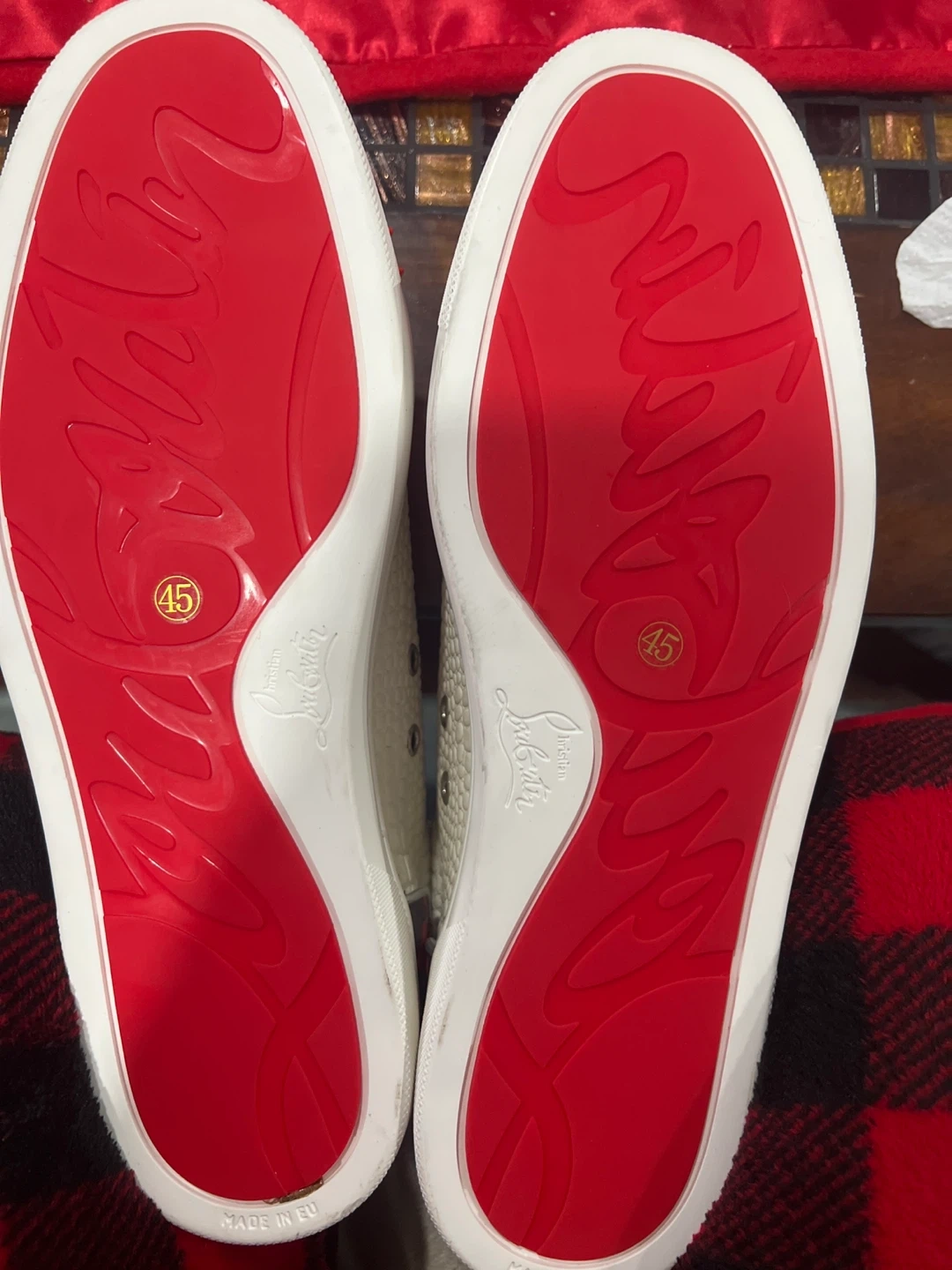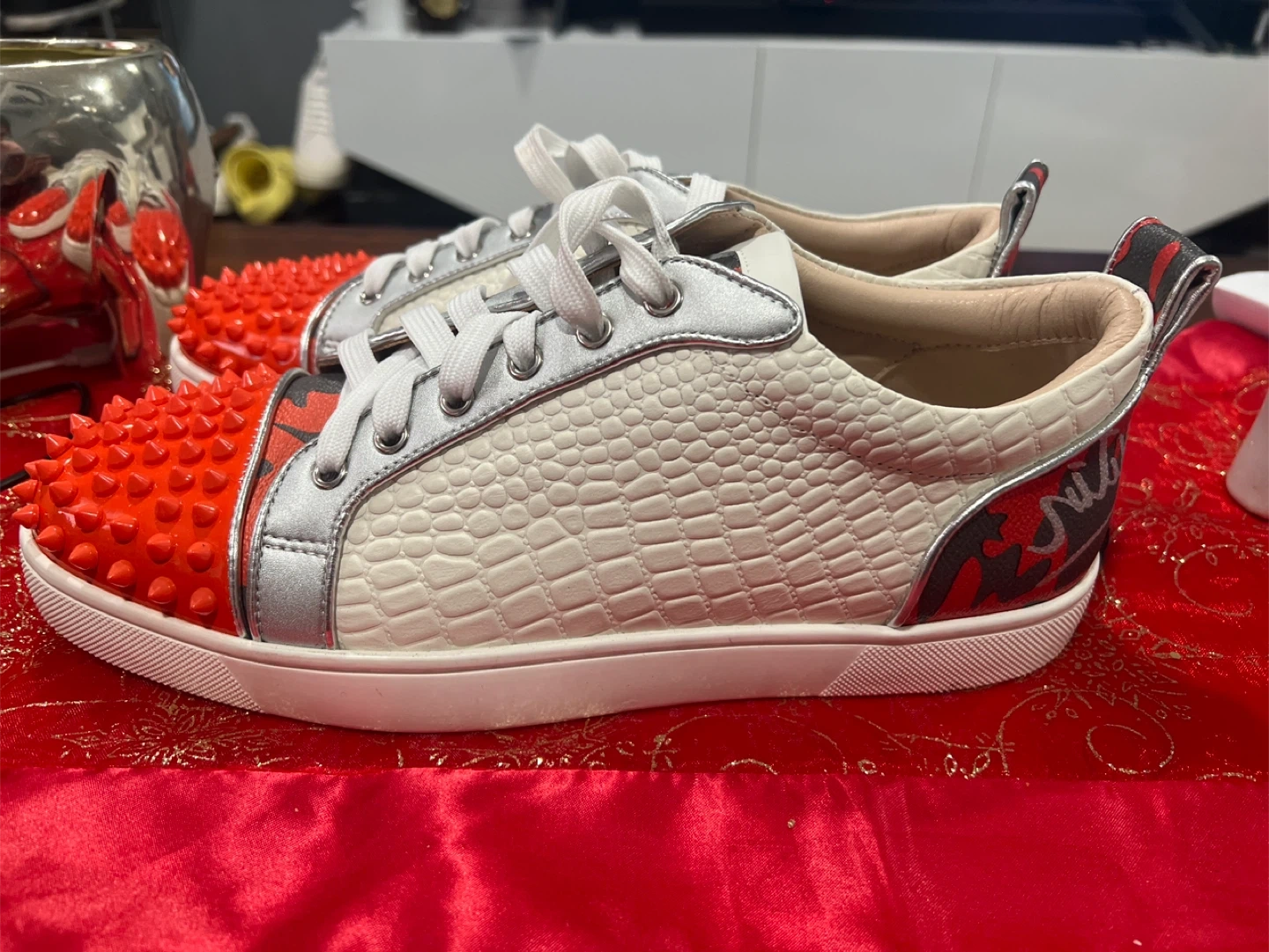 These Christian Louboutin sneakers feature a striking red and gray camouflage pattern with silver accents. They have a white textured leather body and signature red soles. Includes original box and dust bag. Size 45.