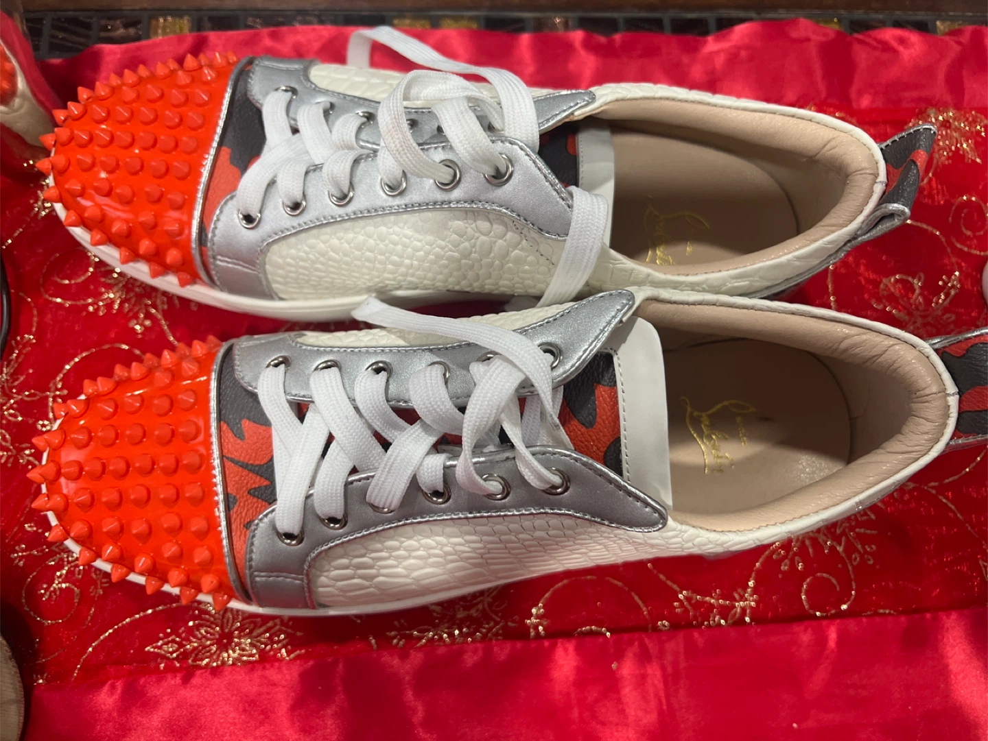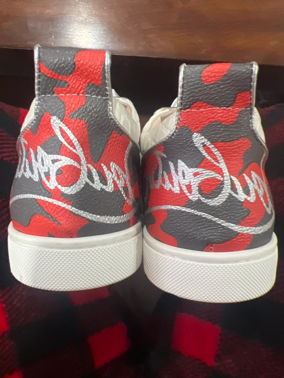 These Christian Louboutin sneakers feature a striking red and gray camouflage pattern with silver accents. They have a white textured leather body and signature red soles. Includes original box and dust bag. Size 45.