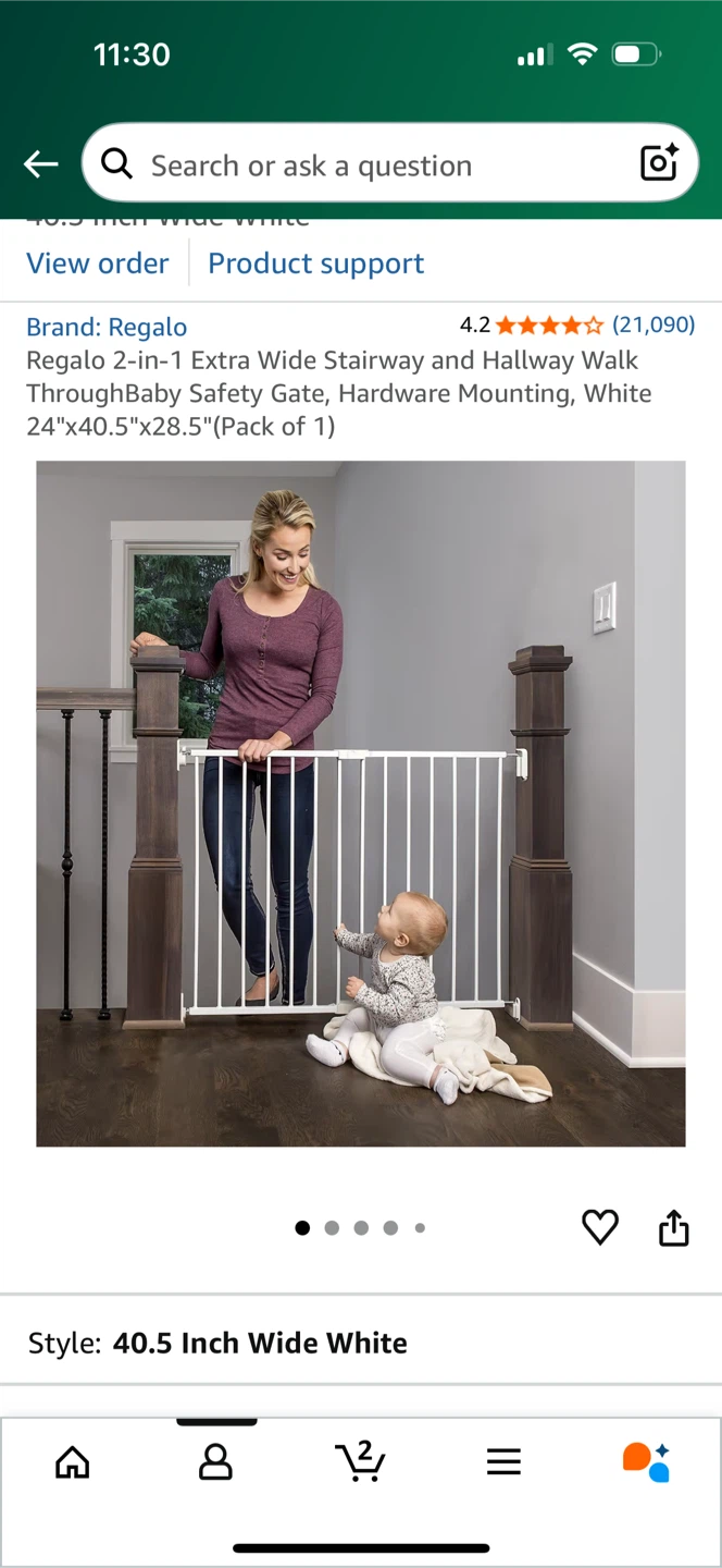 Selling a Regalo 2-in-1 Extra Wide Stairway and Hallway Walk Through Baby Safety Gate. It comes with hardware mounting and is in white. The dimensions are 24"x40.5"x28.5".