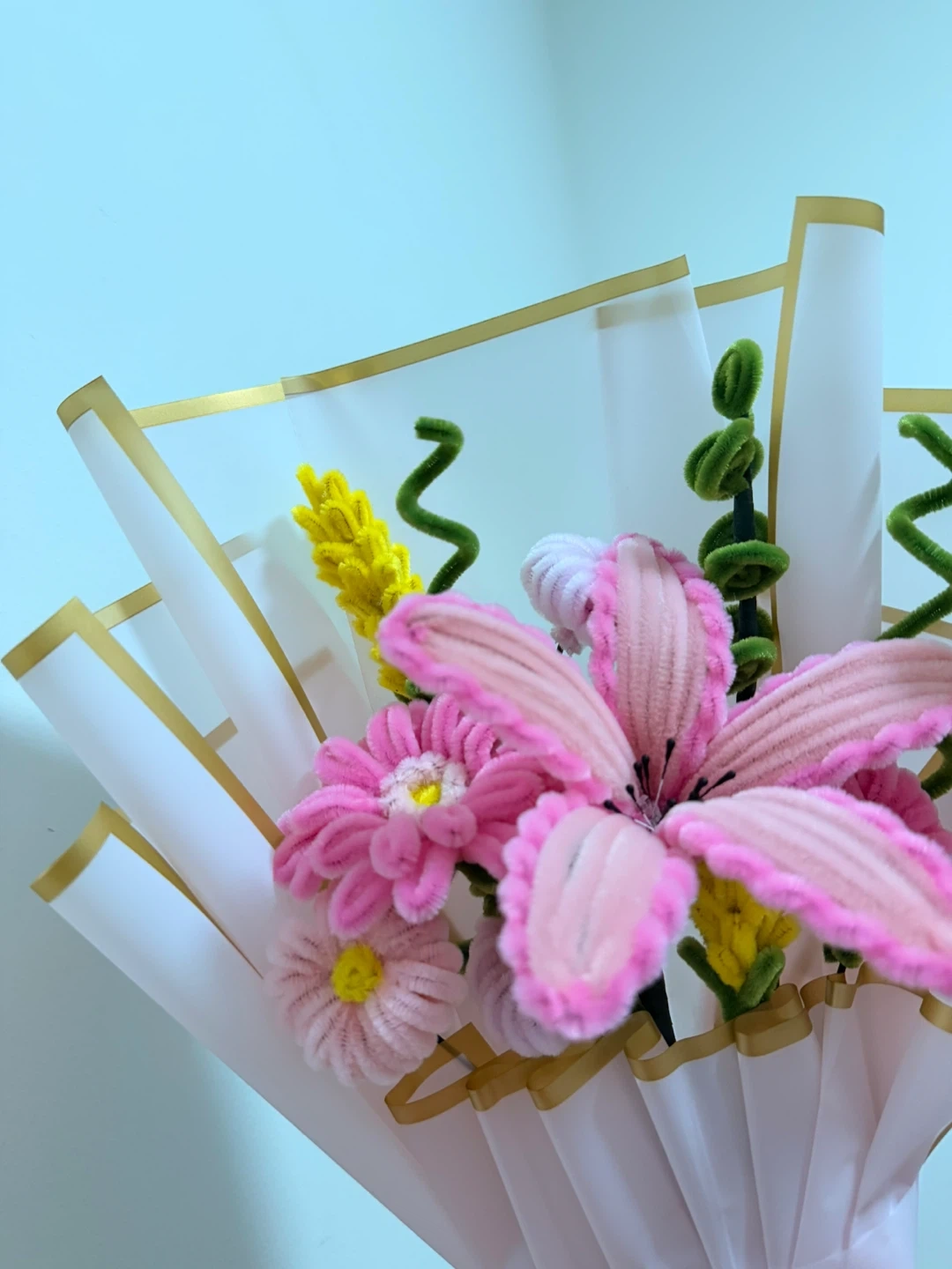 A delightful handmade bouquet featuring pink flowers crafted from pipe cleaners. It's elegantly wrapped in white paper with gold trim and tied with a lace bow. This arrangement's vibrant colours make it a cheerful decoration for any space.