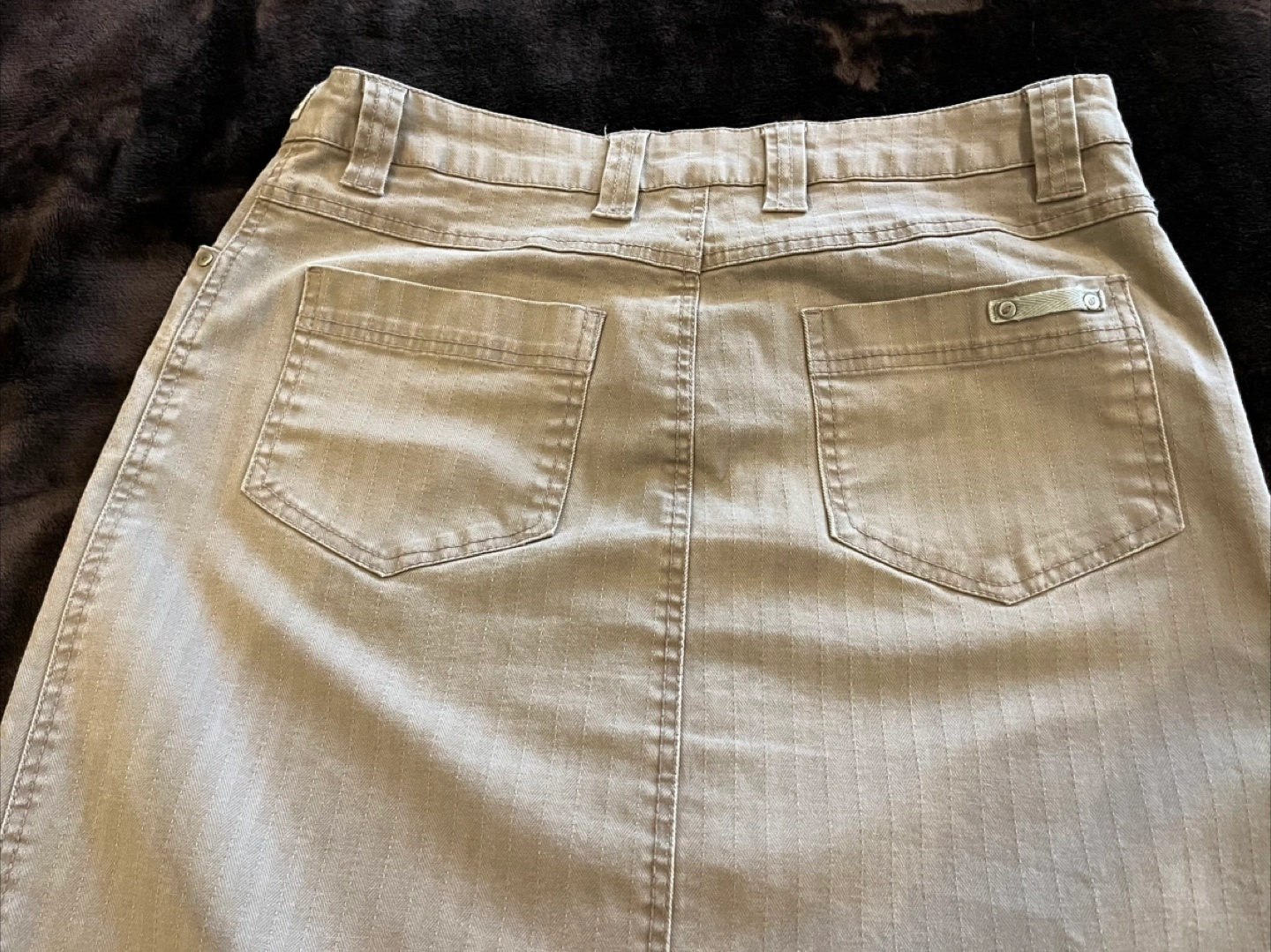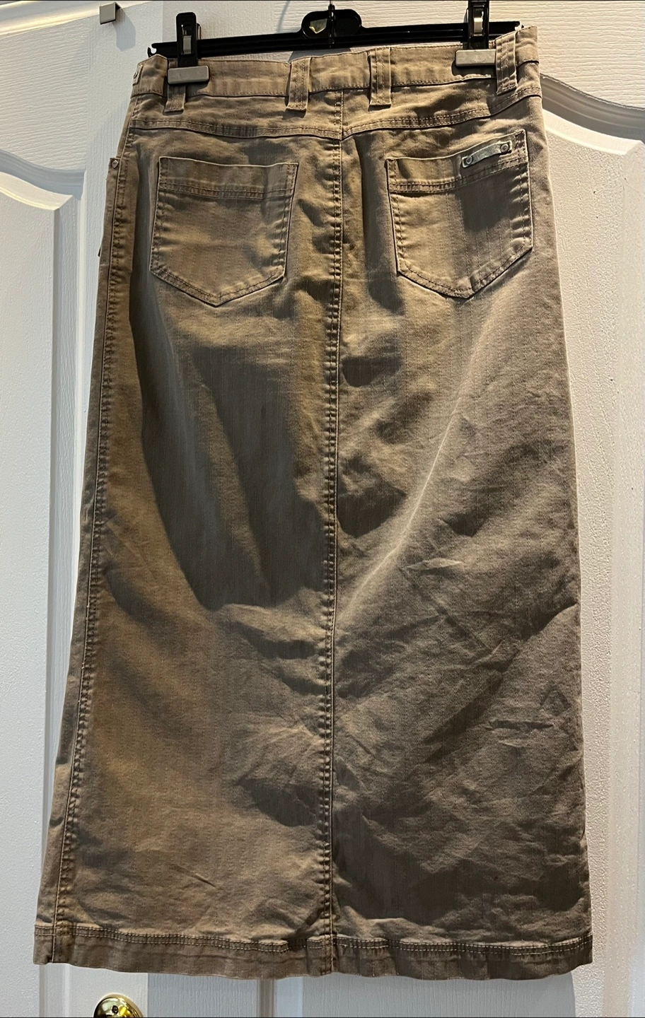 Cotton Ginny long denim skirt, light brown colour with nice texture, close up shown in picture. In good condition, no damage. Size 9. It’s approximately 34” in length with a 15” high split at the front.