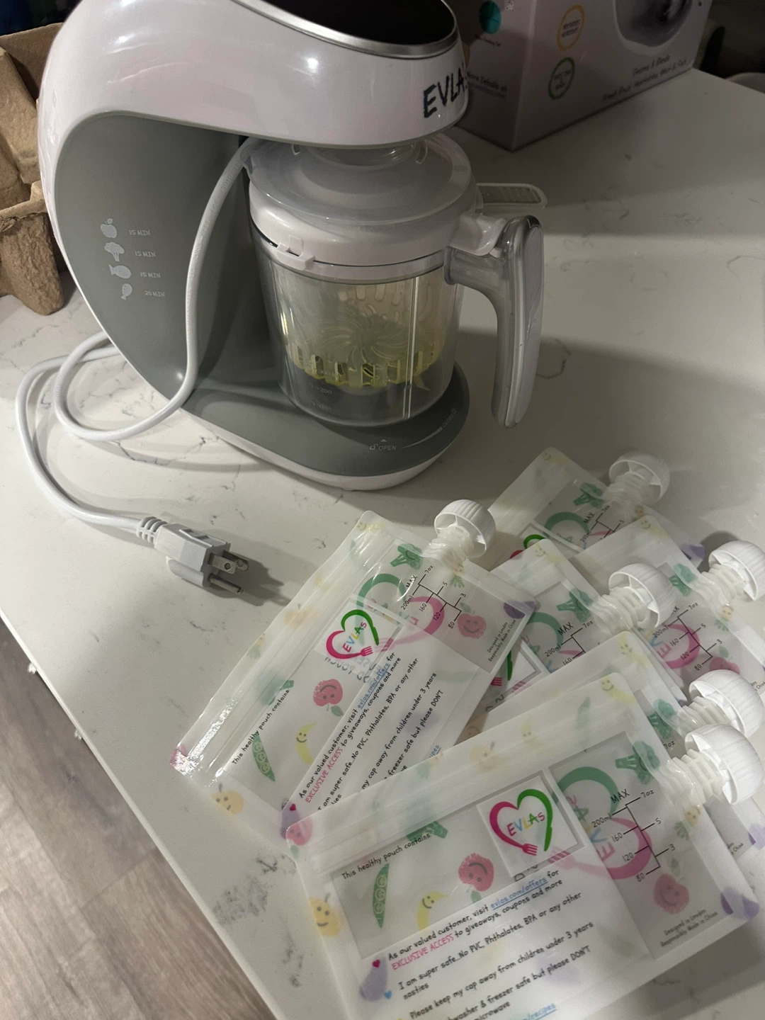 This EVLAS baby food maker steams and blends fresh fruit, vegetables, meat, and fish. It's designed for making healthy, homemade baby food easily. The unit includes multiple reusable pouches for storing prepared food.