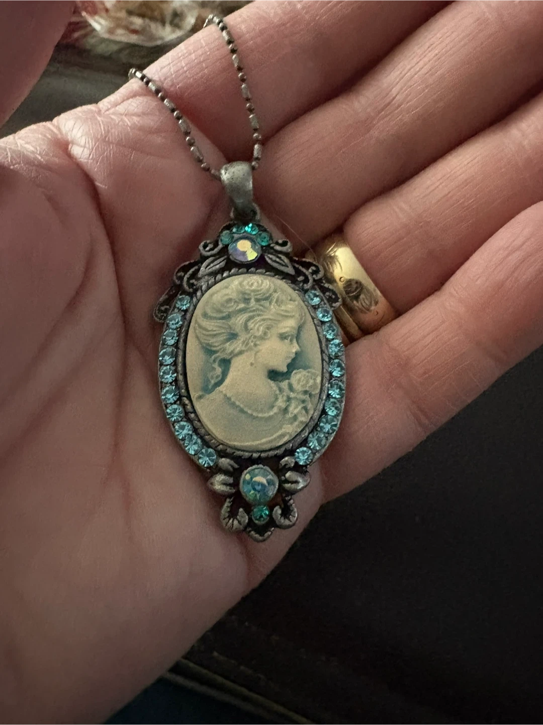Vintage Cameo Pendant Necklace with Blue Crystals