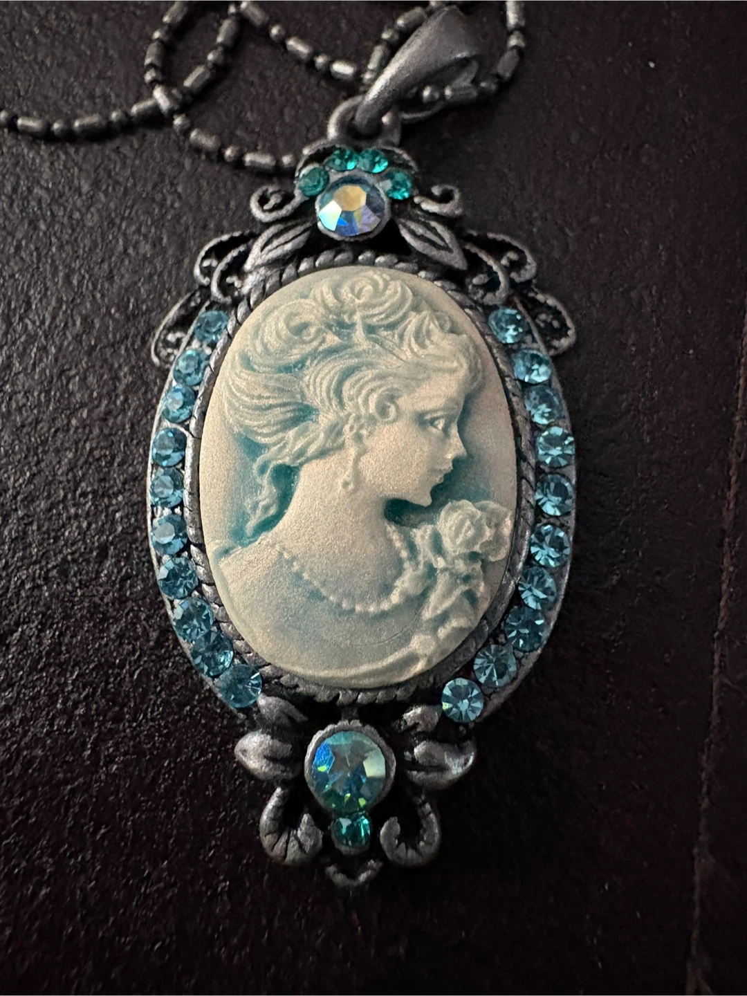 Vintage-style cameo pendant necklace featuring a woman's profile. It's adorned with blue crystals and a silver-tone chain.
