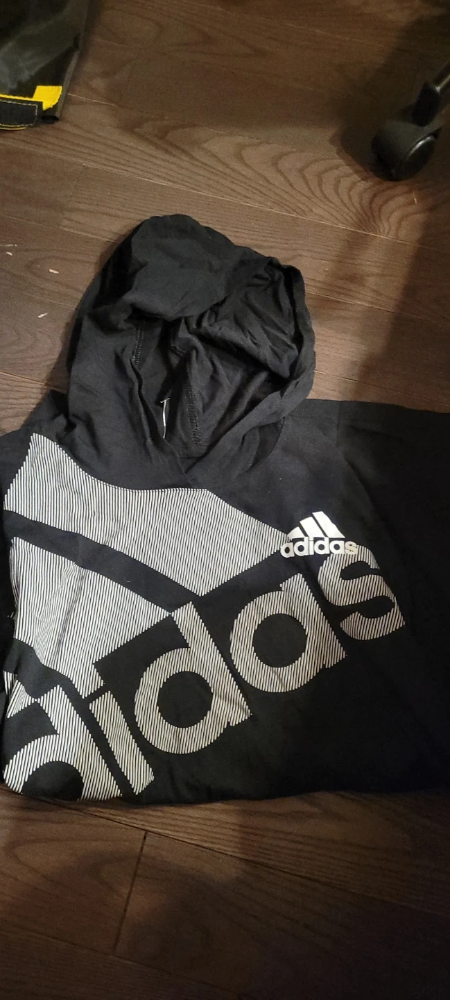 This is an Adidas black hoodie with a large graphic print. It's made from 100% cotton. The size is L. Perfect for casual wear!