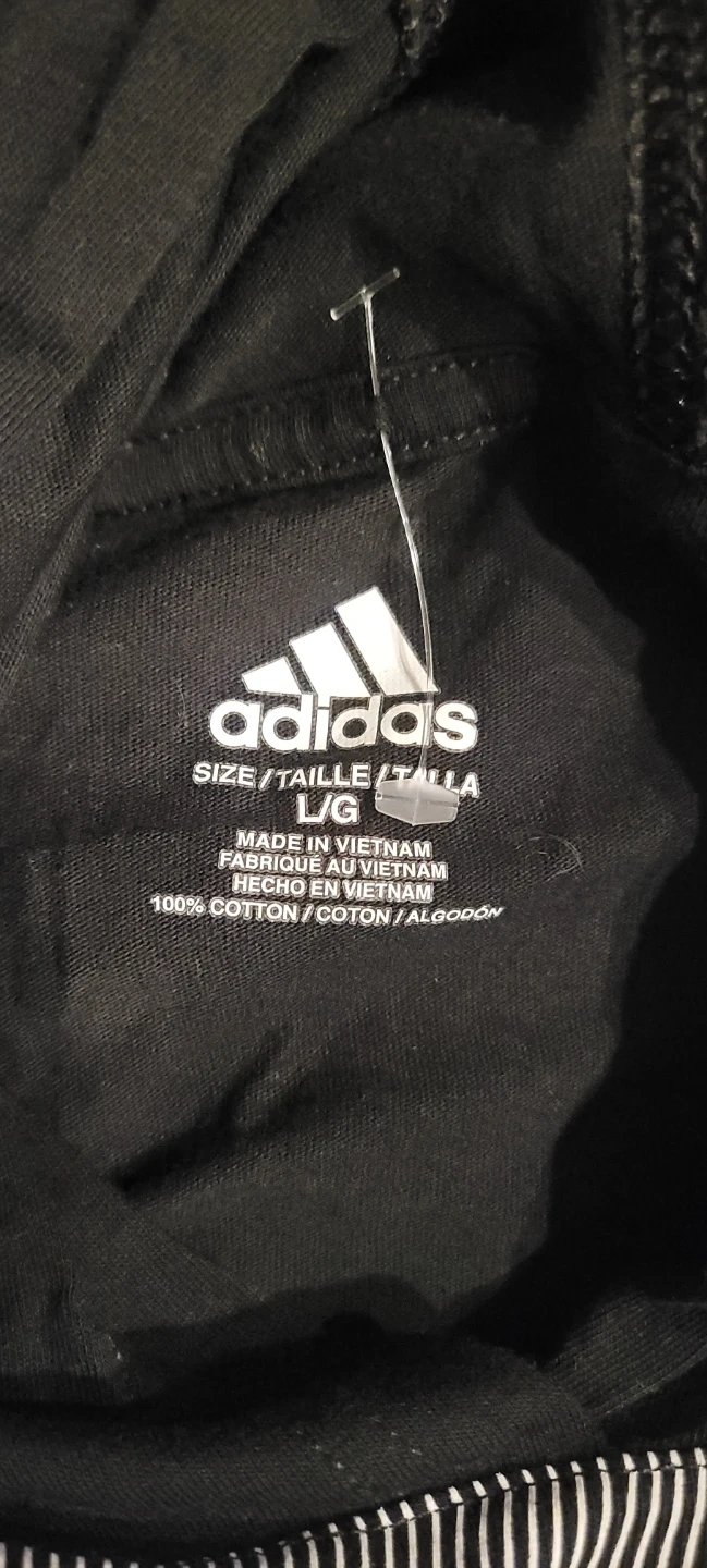 This is an Adidas black hoodie with a large graphic print. It's made from 100% cotton. The size is L. Perfect for casual wear!