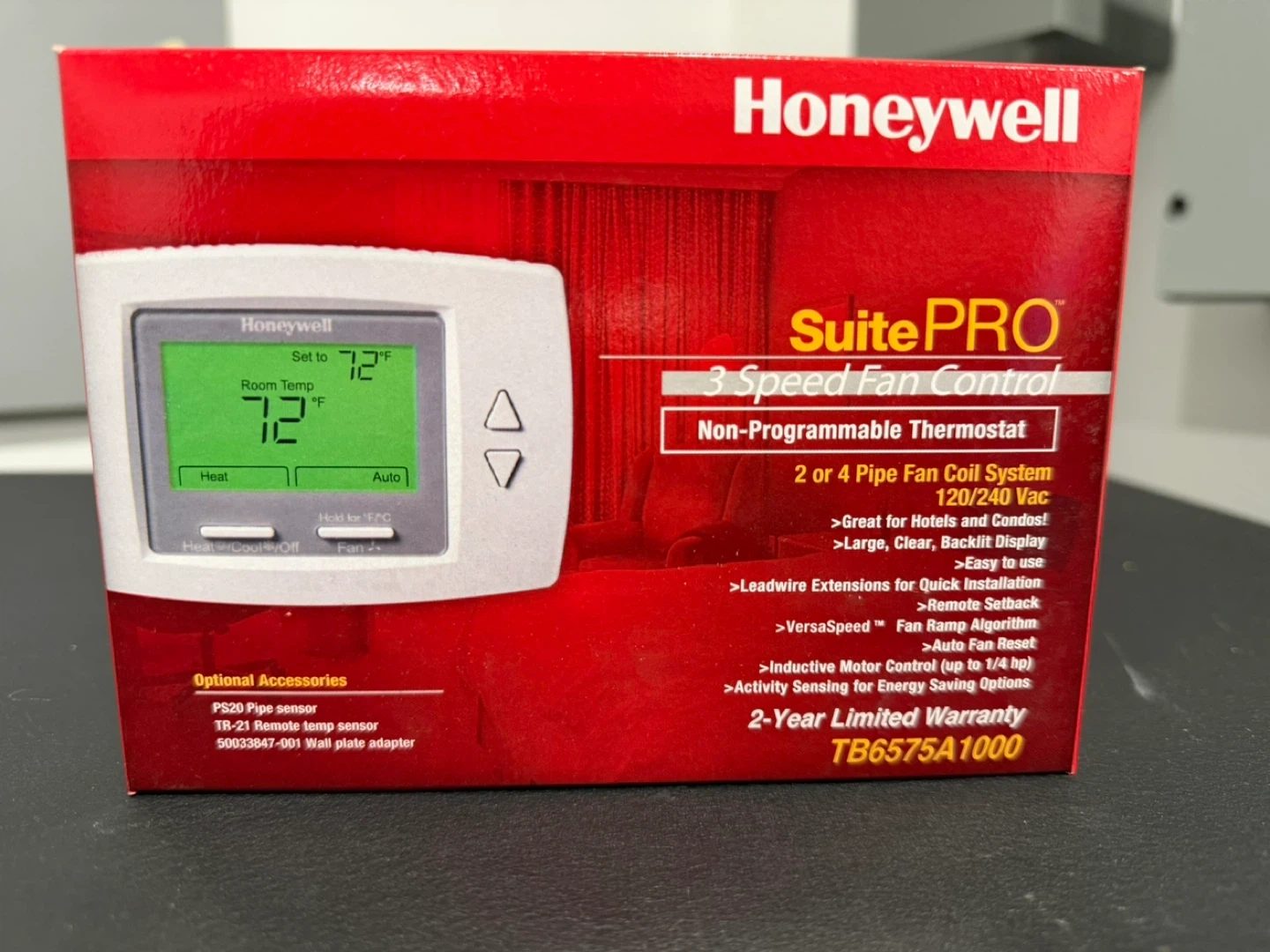This is a Honeywell SuitePRO 3 Speed Fan Control Non-Programmable Thermostat. It's suitable for 2 or 4 Pipe Fan Coil Systems. Features include a large, clear backlit display and lead wire extensions for quick installation.