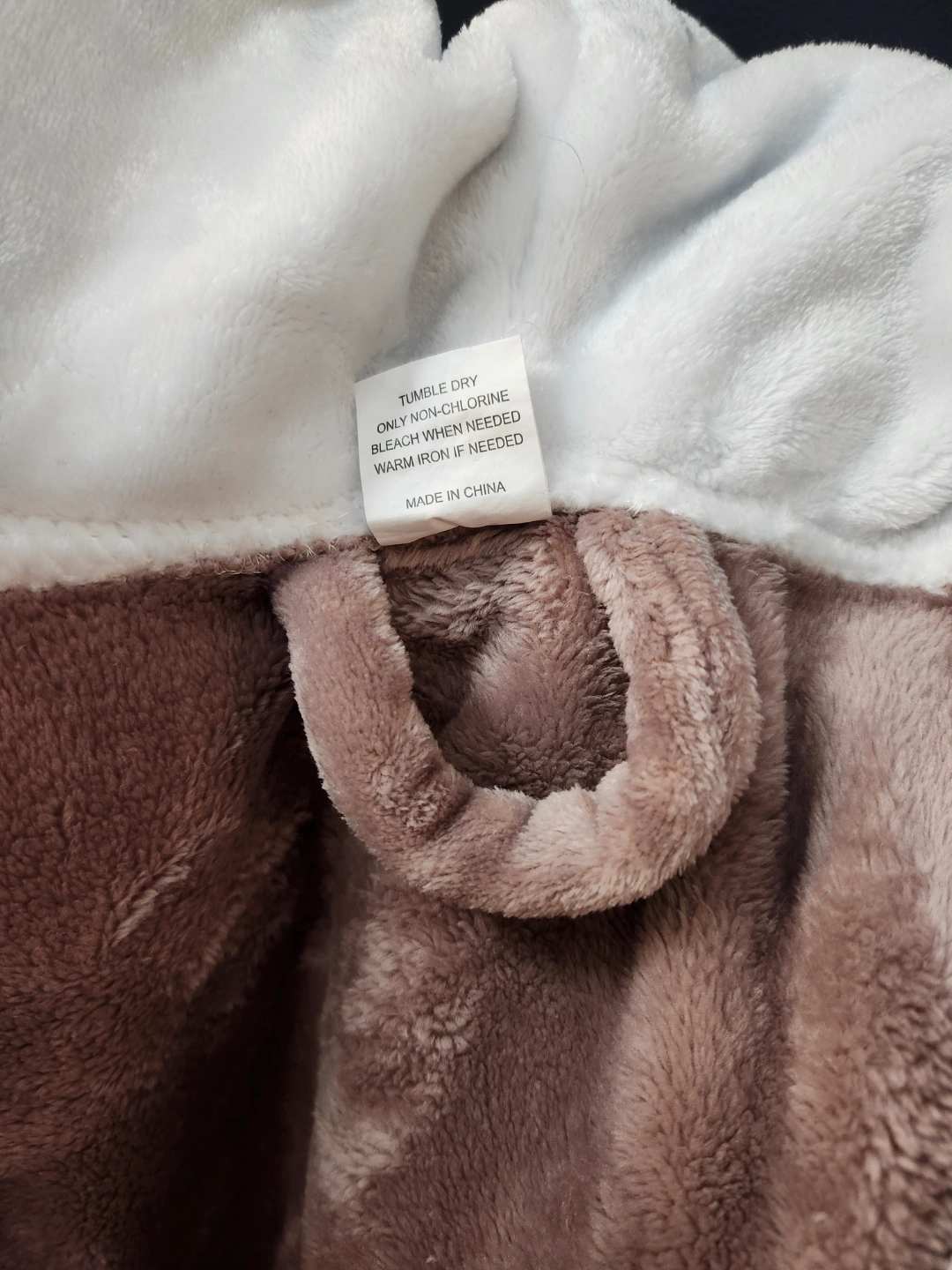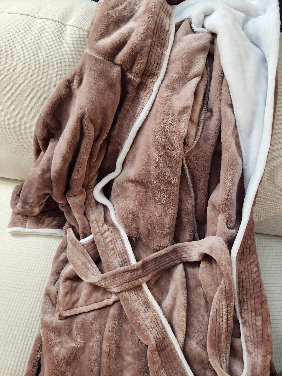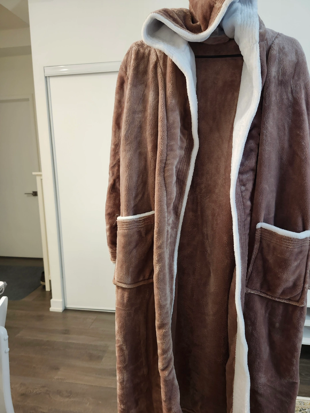 Super soft hooded fleece robe. Brown exterior, white interior. Features pockets and a tie waist. Perfect for relaxing at home.