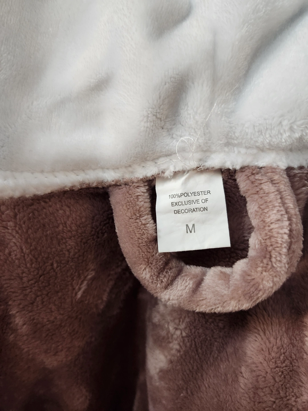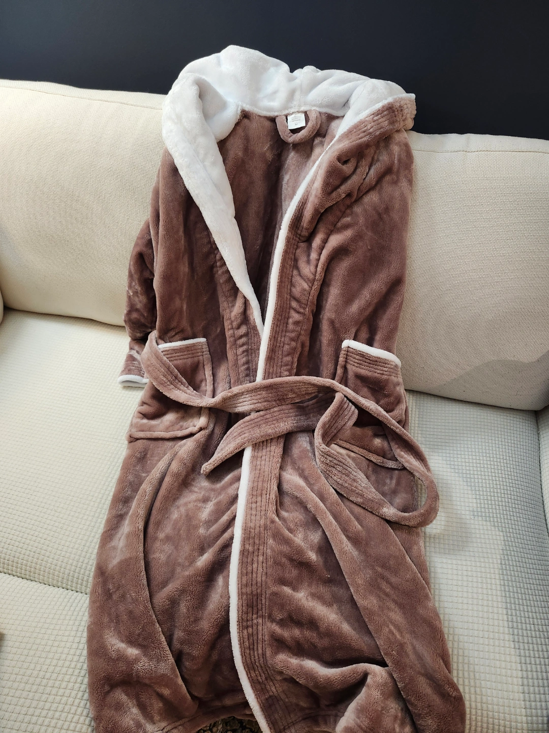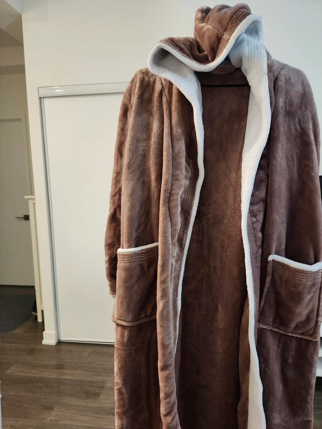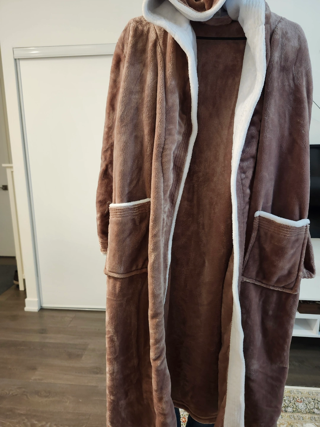 Super soft hooded fleece robe. Brown exterior, white interior. Features pockets and a tie waist. Perfect for relaxing at home.