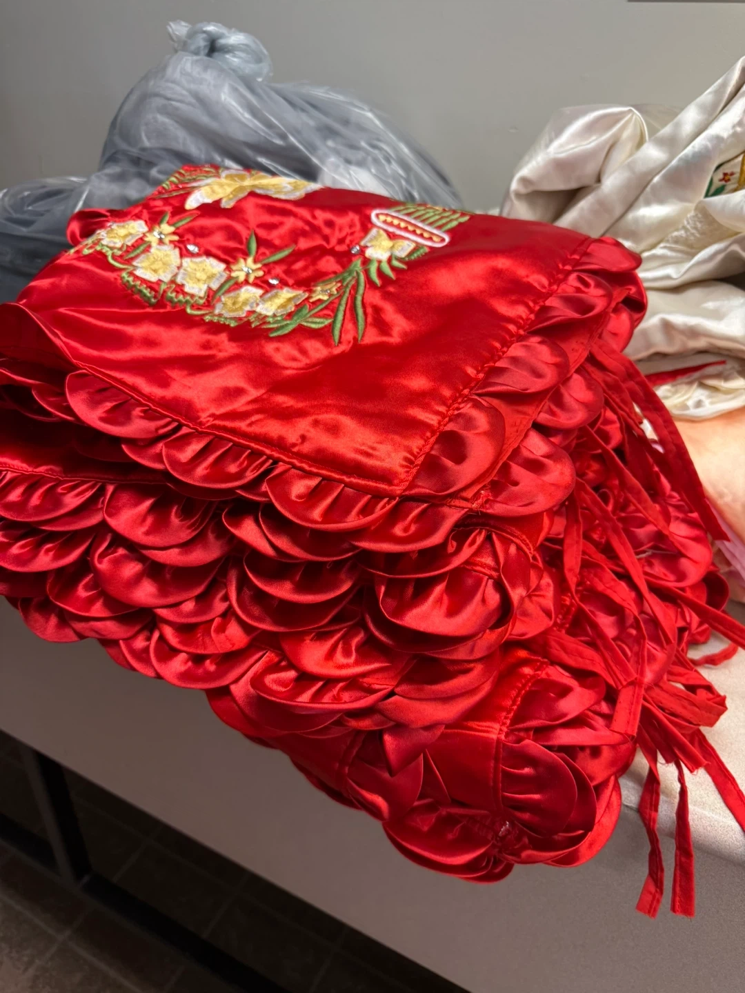 Set of four bright red satin placemats, each adorned with intricate floral embroidery in yellow and green. They feature a decorative ruffled edge and tassels.