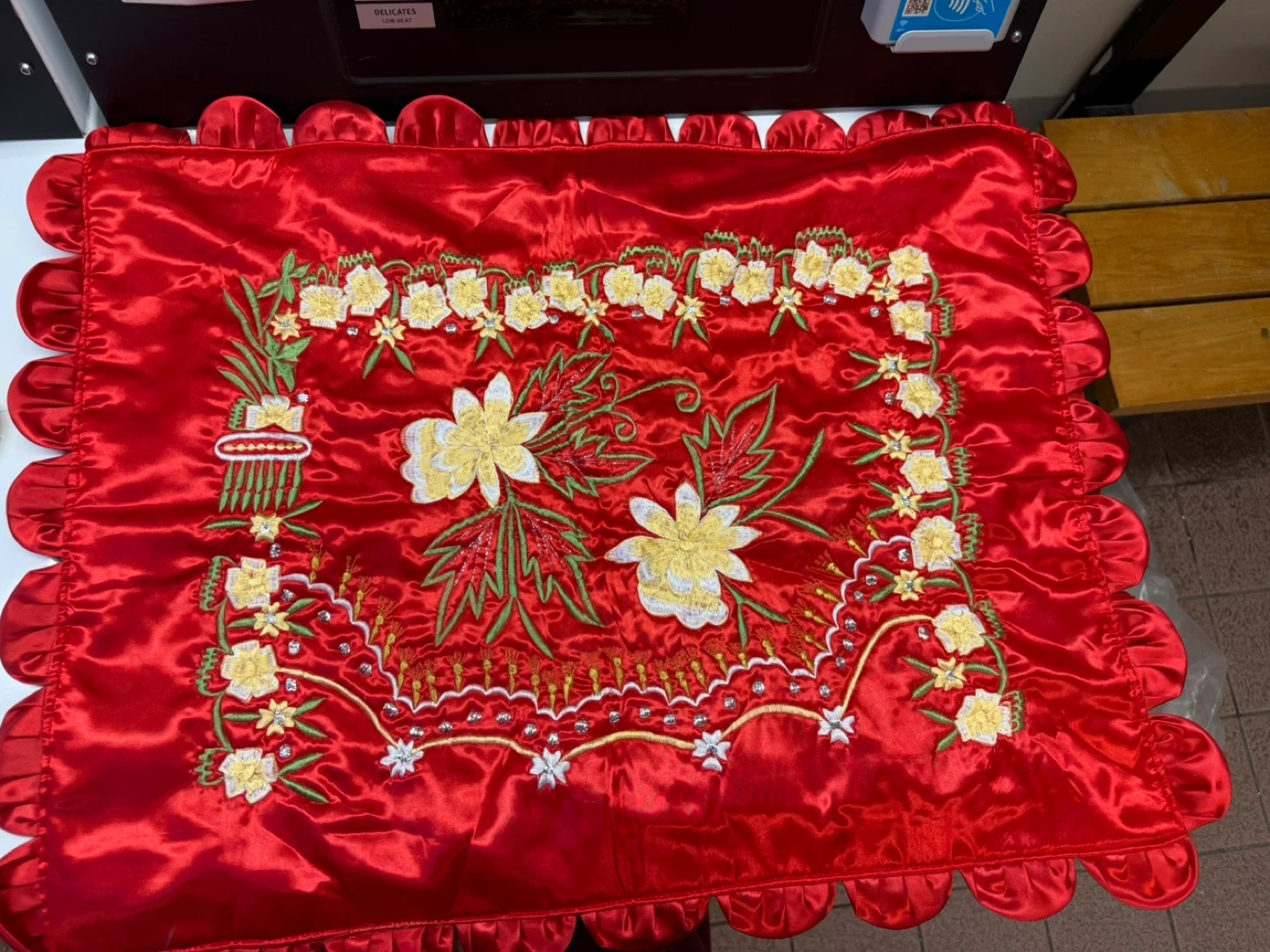 Set of four bright red satin placemats, each adorned with intricate floral embroidery in yellow and green. They feature a decorative ruffled edge and tassels.
