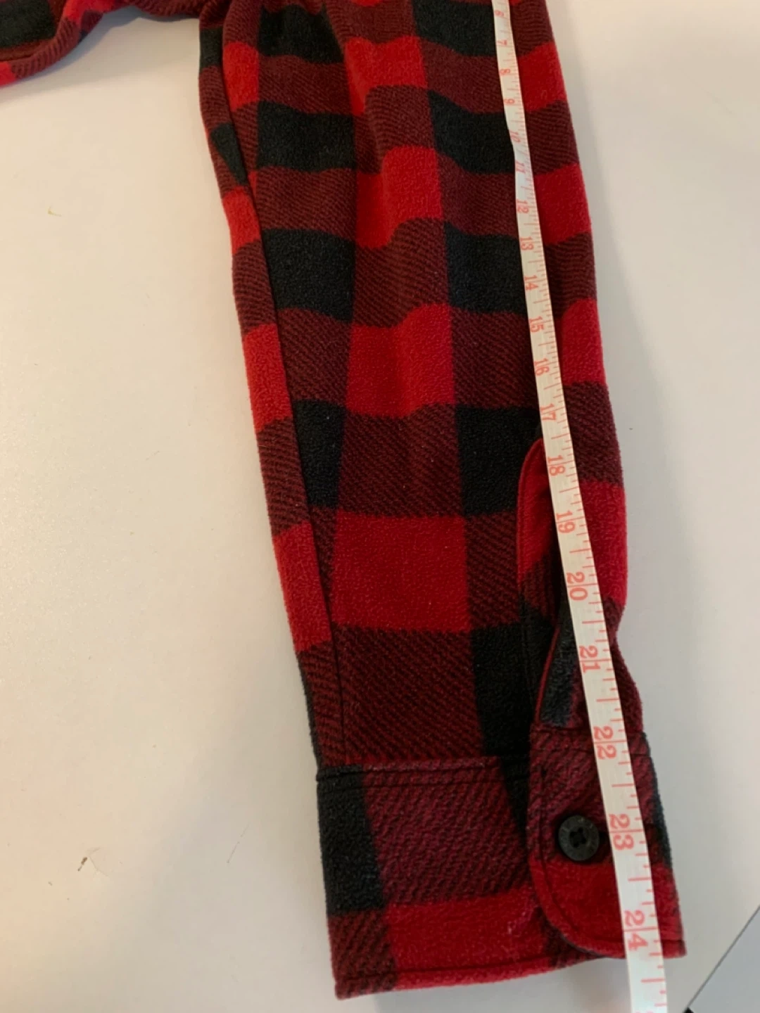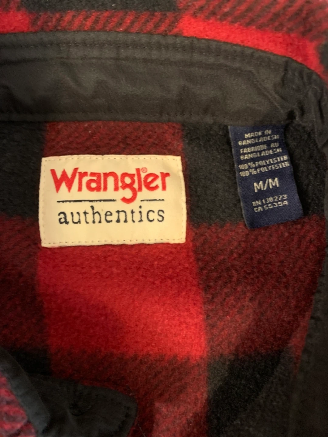 Cozy up in this Wrangler Authentics flannel shirt! It's a red and black plaid pattern, perfect for fall or winter. The size is M/M, and it's made of 100% polyester. It measures approximately 23 inches across the chest.
