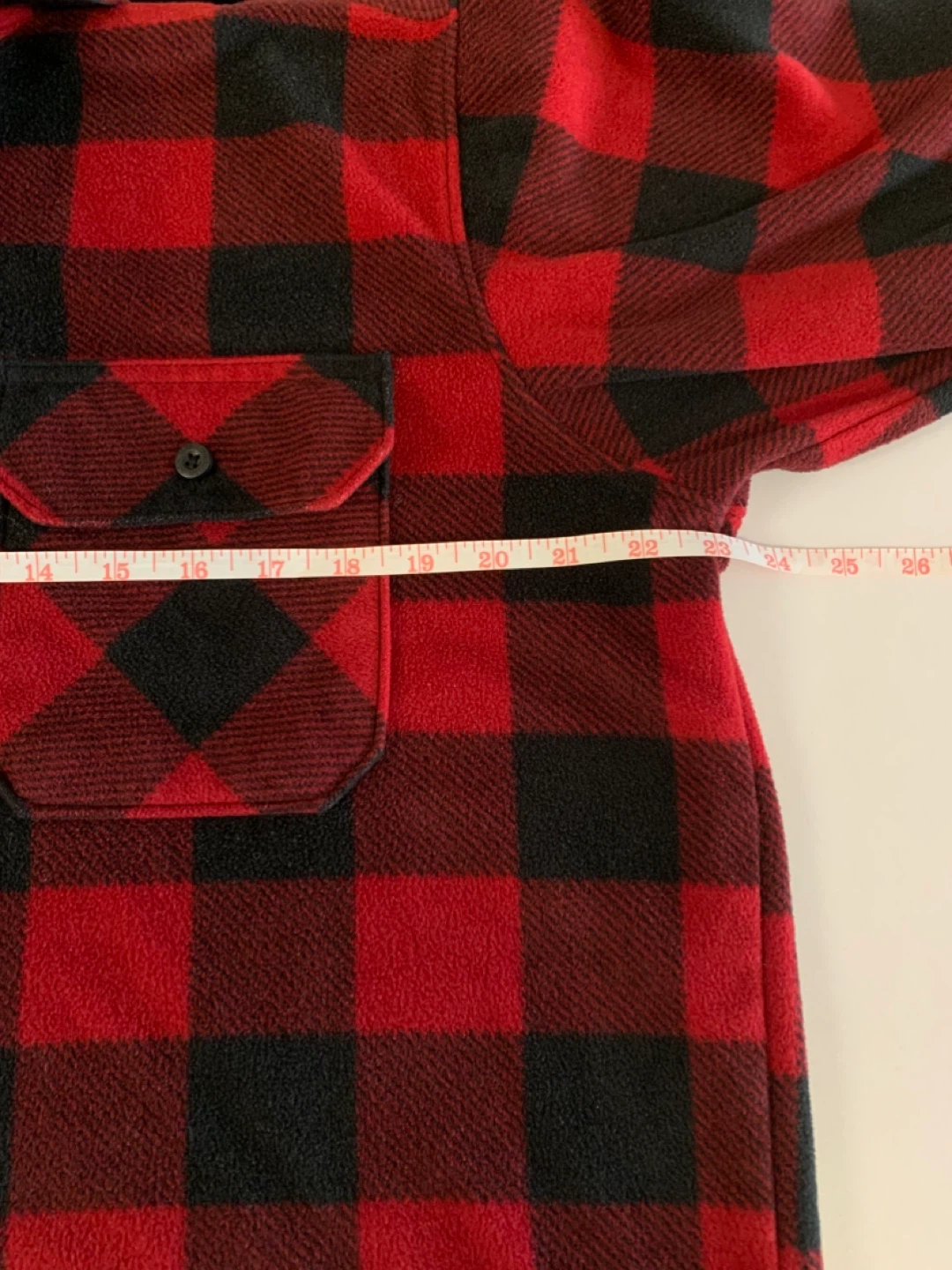 Cozy up in this Wrangler Authentics flannel shirt! It's a red and black plaid pattern, perfect for fall or winter. The size is M/M, and it's made of 100% polyester. It measures approximately 23 inches across the chest.
