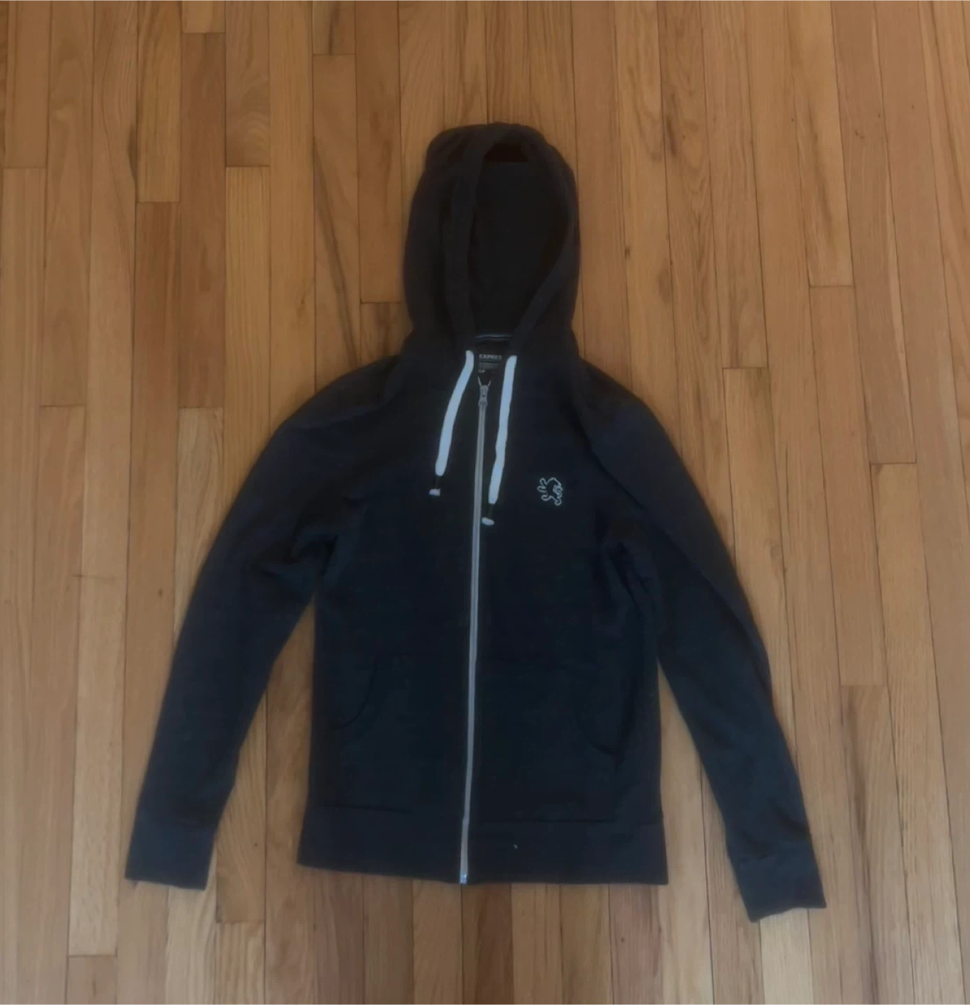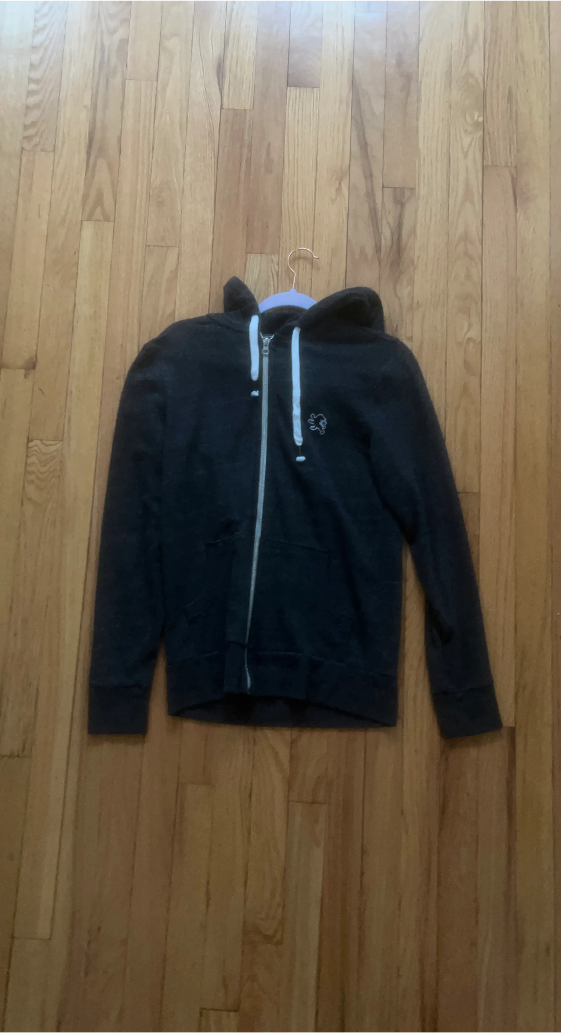 This is a dark gray zip-up hoodie with white drawstrings and a small logo on the chest. It has a full zipper closure and pockets. It's made of a comfortable fabric blend.