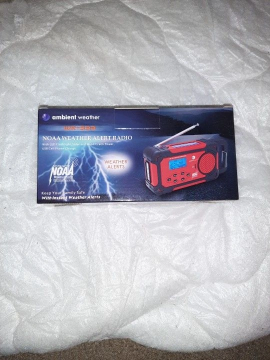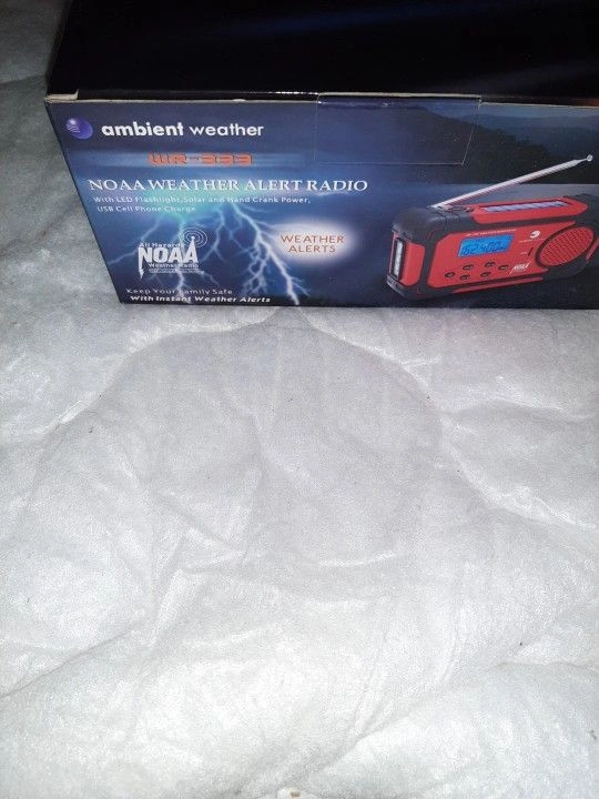 New in box Ambient Weather NOAA Weather Alert Radio with LED Flashlight. Solar and hand crank power, plus USB cell phone charge. Exact amount in cash only for pickup in QNS.
