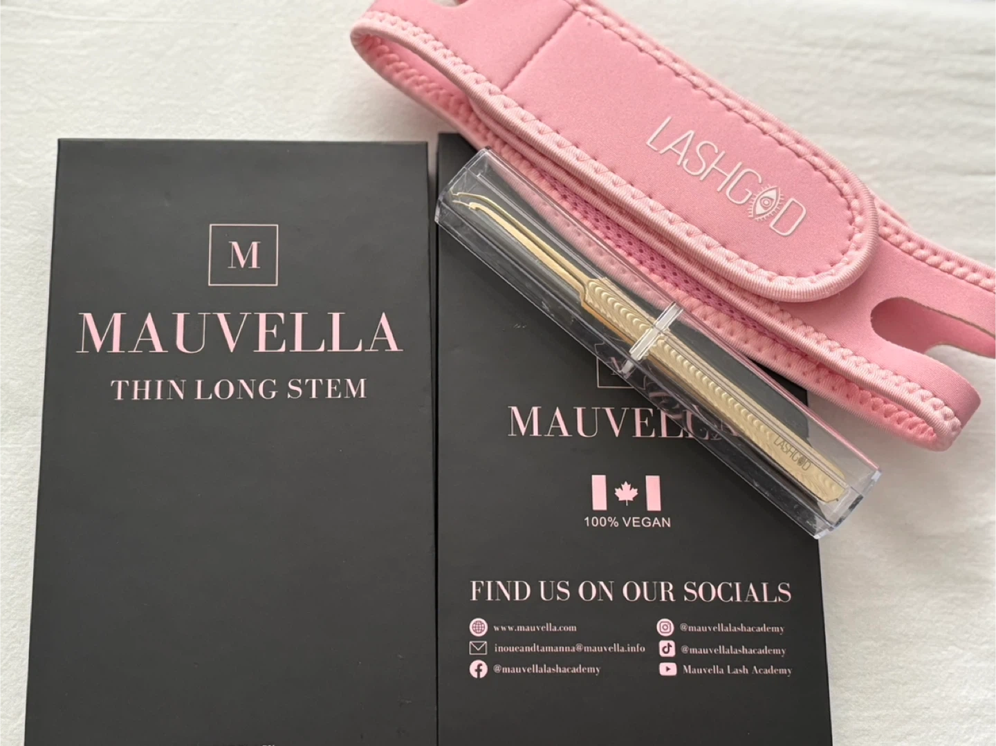 Selling a set of Mauvella Thin Long Stem tweezers and a Lashgod headband. The tweezers are 100% vegan. Perfect for your lash application needs!